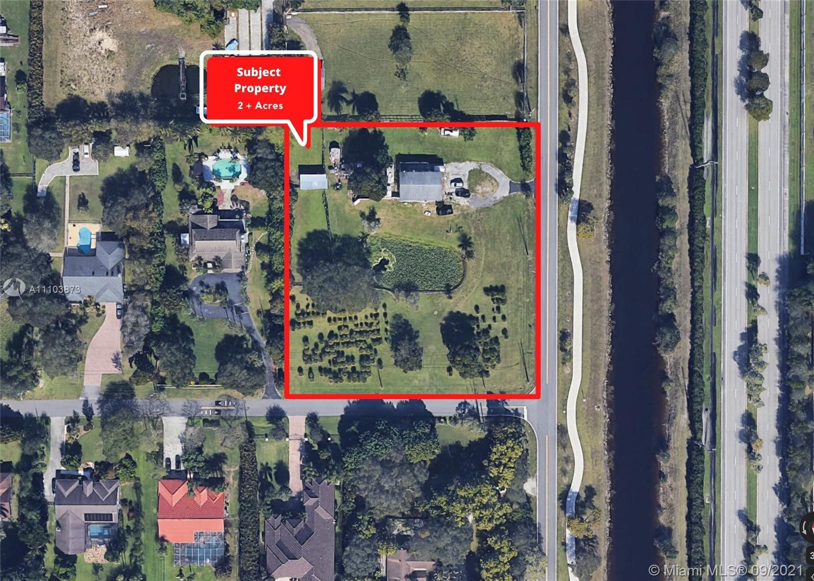 Extremely Rare opportunity to own a private 2.16 acre estate lot complete with a 4 bed 2.5 bath house in desirable Plantation Acres. Lot can be split into two parcels. Second lot has second water meter in place. Build your dream home or renovate existing house. Developers welcome! Large barn and well stocked lake on site. Current house needs upgraded. Acreage includes beautiful mature trees included avocados, bananas, black olives, and oak trees. Don’t miss this opportunity invest in one of the most desirable neighborhoods in South Florida.