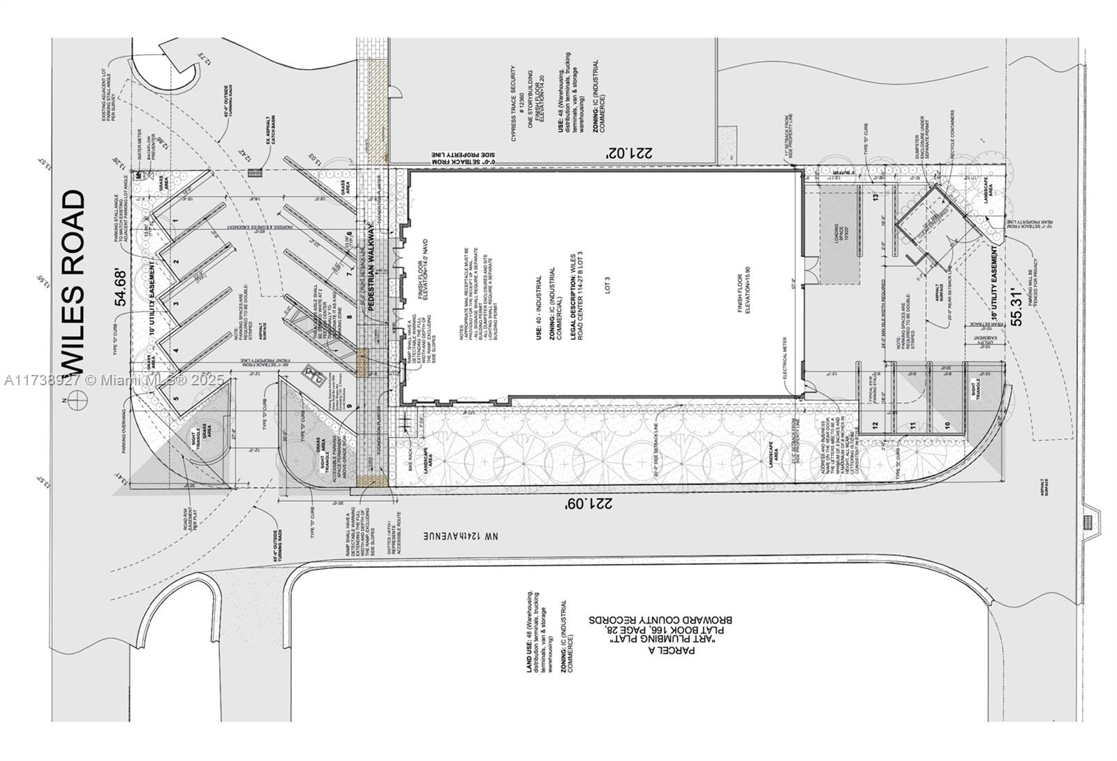VACANT LAND . Shovel Ready - Approved Plans for 8,040 SF Interior SMOOTH STUCCO building WITH 3/4" THIN BRICK VENEER will include two SHOWROOMS, one CONFERENCE ROOM, one OFFICE, 4 ADA compliant BATHROOMS, two STAIRWAYS to MEZZANINE STORAGE areas and two DOUBLE-HEIGHT WAREHOUSES areas in rear of building. All openings will be ALUMINUM FIXED WINDOWS with INSULATED GLAZING and ALUMINUM DOORS as approved by Miami-Dade standards as well as an ALUMINUM GLASS STOREFRONT and ENTRY SYSTEM, ALUMINUM ROLL-UP DOOR. PARKING is provided to comply with city requirements. The scope of work will include normal mechanical, electrical and plumbing. Flooring will be of polished concrete throughout, except for the 2nd story storage. Ample vegetation is provided to comply with city requirements