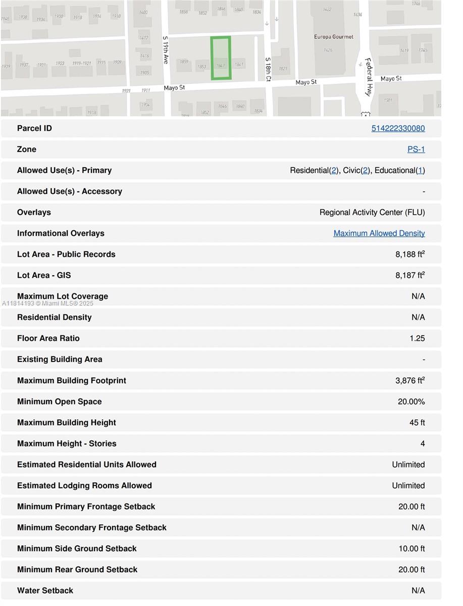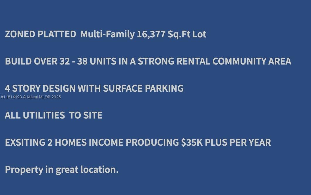 DEVELOPMENT OPPORTUNITY! Two adjacent lots (1841 & 1847 Mayo Street) are being sold together, offering a combined total of 16,377 sq. ft. in the site plan development phase. This is a prime income-generating opportunity to build a luxury apartment complex in the rapidly growing Hollywood market. Zoned for high-intensity, multi-family use, the property allows for up to 32 units with a mix of 4 studios, 14 one-bedrooms, and 14 two-bedrooms. With rental demand currently high in the area, the possibilities for development are endless. Both properties are currently tenant-occupied on month-to-month leases, providing flexibility for future plans.