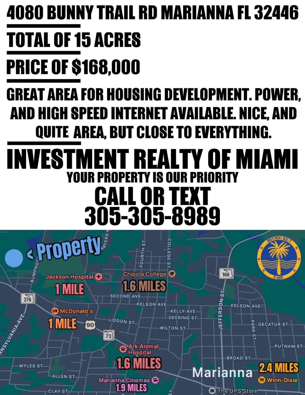 This property is a 15-acre parcel located in Marianna, Florida, a town known as ''the city of southern charm.''It is situated on the northwest corner of the historical street where Highway 73 merges into Highway 90.The property is described as high and dry, with brand new paved roads on two of its three sides.It offers a nice, quiet, and secluded environment while being less than 1 MILE from downtown.The property features a lot of bamboo, and the bamboo shoots are mentioned as being organic food that comes out every spring.Approximately one acre around the midpoint has been cleared.There are 6 electricity posts circling the property, making electricity easily accessible,