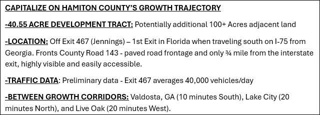 Rare 40.55-acre tract in Jennings, Hamilton County, FL just off Exit 467 (SR 143), the first Florida exit southbound on I-75 from Georgia. Fronts CR 143 with paved access, only 3/4 mile from I-75 and 4 miles south of the GA line. Preliminary data suggests traffic at Exit 467 averages 40,000 vehicles/day (FDOT confirmation pending). A new 40,000 sq. ft. Poker/Card Room is under construction nearby (est. completion 2026). Area growth includes an Industrial Park at Exit 461, the planned 350-acre Stone Bridge mixed-use project at Exit 451 (2027), and Suwannee Iron Works relocating 100+ jobs. Zoned AG-4 (1 house/5 acres) with strong potential for rezoning, with additional adjacent land potentially available.