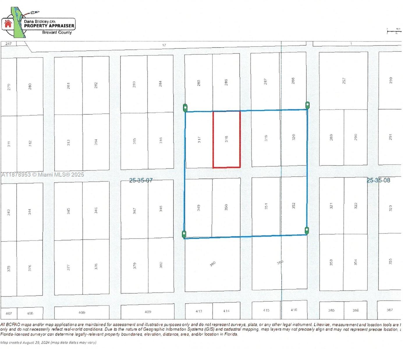 Investment Opportunity – 8 Residential Parcels in Brevard County! Looking for a prime piece of Florida land? This package includes 8 adjoining parcels in Brevard County, zoned GU (General Use) and designated 0010 – Vacant Residential Land (Single Family, Platted). Each parcel is approximately 1.25 acres (±54,450 sq ft), offering plenty of space and future potential. With no current road access, this land presents a rare opportunity for savvy investors or future development as the area grows. All eight parcels are being sold together. Brevard County Account Numbers: 2500349, 2500350, 2500351, 2500352, 2500365, 2500366, 2500367, 2500368 Seize the chance to secure your piece of Brevard County today!