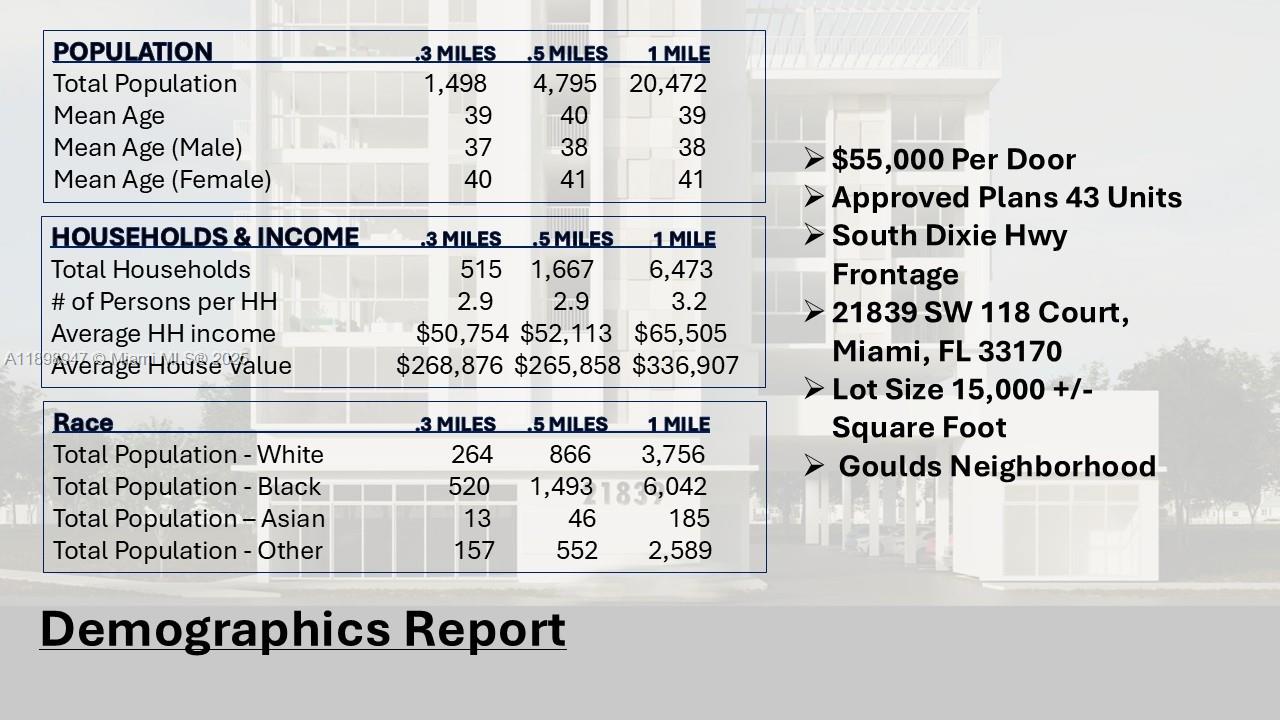 Development Opportunity on South Dixie Highway – Goulds, FL Prime development site available for sale, prominently located along busy South Dixie Highway in the fast-growing community of Goulds. The area is experiencing significant growth, with numerous completed and ongoing development projects throughout Goulds and South Dade along the US-1 Corridor. Approved development plans for 43 residential units with parking are included, offering an exceptional opportunity for builders and investors to capitalize on this expanding market. Key Highlights: * High-visibility frontage on South Dixie Highway (US-1) * Approved plans for 43 units with on-site parking * Surrounded by new and planned developments * Located in one of South Dade’s most active growth corridors