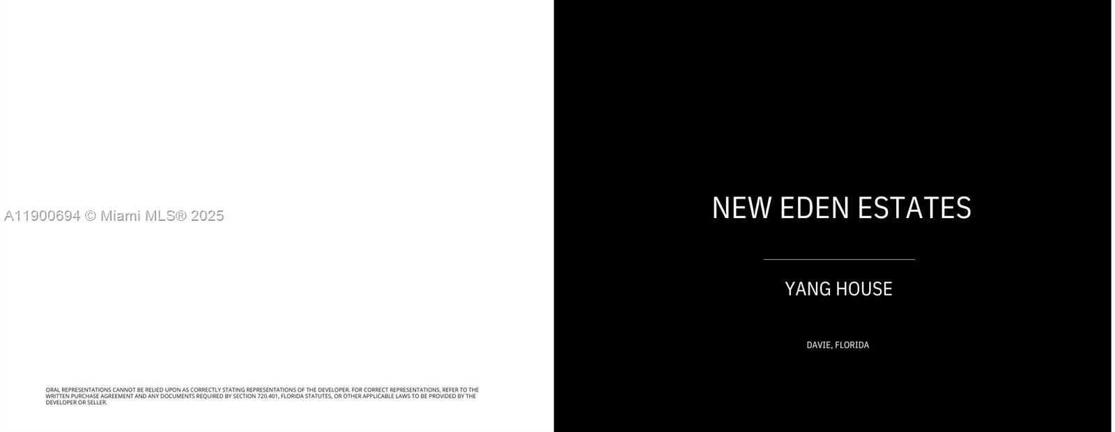 A rare opportunity to own the site of Yang House within the visionary enclave of New Eden Estates — a private two-residence sanctuary in Davie where design and nature unite in radiant harmony. Spanning approximately 1.815 acres of canal-front land, this exceptional parcel offers unmatched privacy and connection to nature. Conceived as an architectural statement of light and modern refinement, Yang House will feature over 10,000 sq.ft. of interiors and 25,000 sq.ft. of outdoor living with customizable finishes, framed by tropical landscapes designed by Jesus Pacheco. Just minutes from Miami and Fort Lauderdale, the sale of this property is subject to building The Yang House with the designated developer and builder, ensuring a seamless realization of this world-class architectural vision.