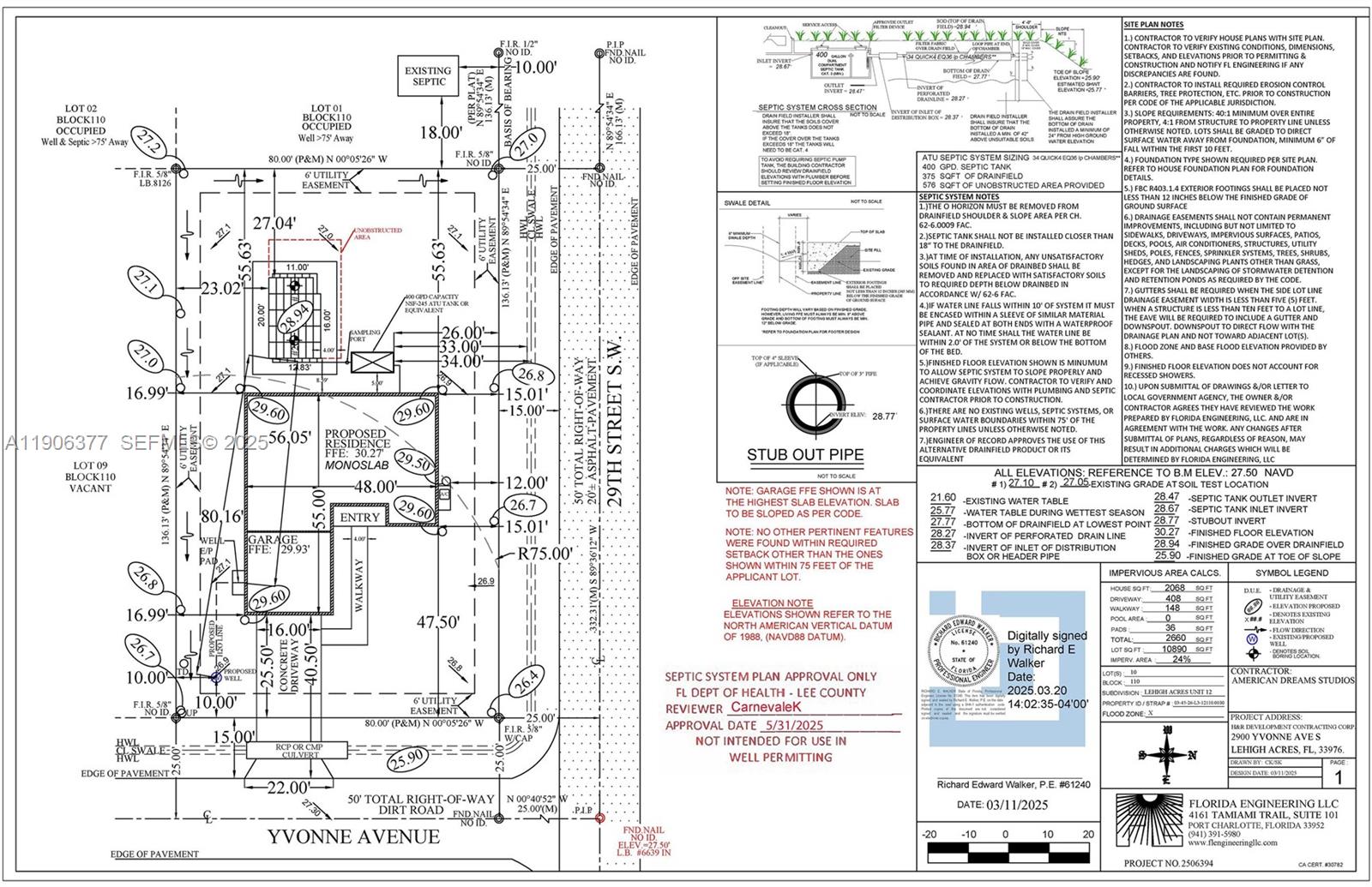 The survey has already been completed, and a model plan has been approved, so it is READY to build the property. Located in a rapidly growing area, these properties present an excellent investment opportunity. The 33976 zip code is the most popular in Lehigh Acres. Spanish is also spoken in the area. They are close to Southwest Florida International Airport, Fort Myers beaches, I-75, SR 82, shopping centers, medical services, schools, restaurants, JetBlue Park, and more. What truly sets this property apart is that it includes advanced planning and development work for a contemporary style home, saving the buyer months of paperwork, upfront costs, and administrative risk. The package includes: Complete architectural design for a contemporary 2,068 sq ft home with 3 BEDROOMS, 2 FULL BATHROOMS, and a 2-CAR GARAGE + Completed topographic survey, ready for immediate use + Approved floor plans, ready to proceed with final permitting + Approved SEPTIC SYSTEM design, including the AEROBIC TREATMENT UNIT, meeting all current county requirements. No trees to remove. Compared to other raw lots in the area, this parcel offers substantial savings in technical studies, engineering, design work, and permitting time, which fully justifies its higher market value. This property is READY to build. Located in a rapidly growing area, 33976 is one of the most sought-after areas in Lehigh Acres.