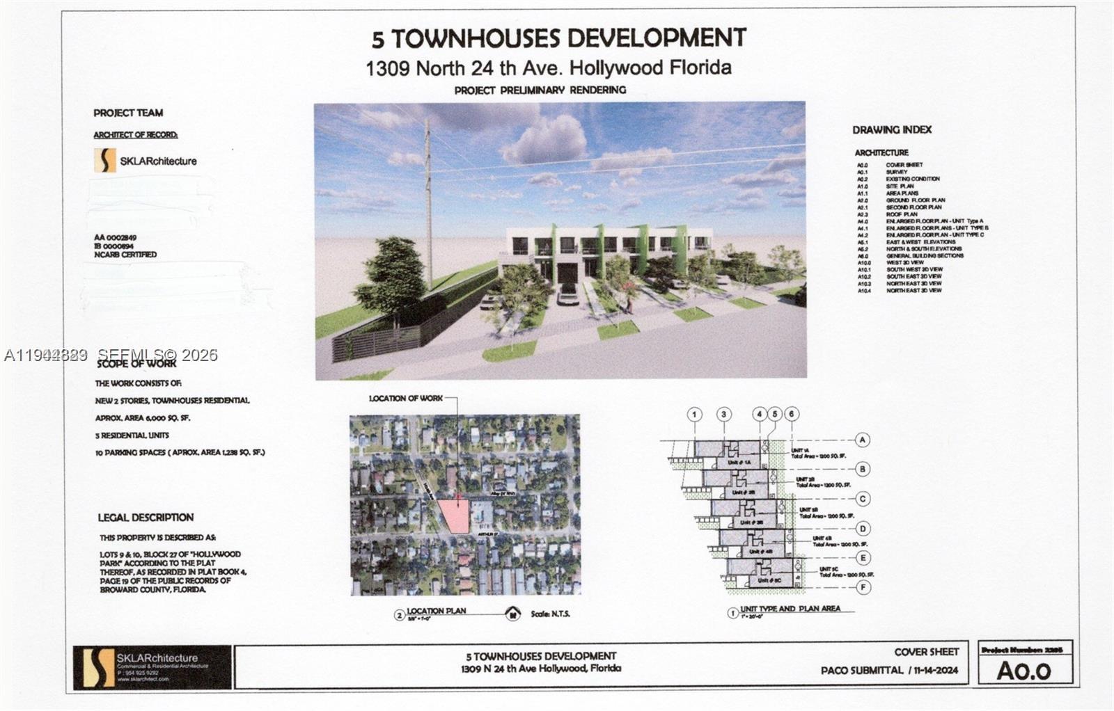 INVESTOR'S DREAM!!! GREAT DEVELOPMENT OPPORTUNITY FOR 5 TOWNHOMES (2BR+DEN/2.5BA EACH) ON THIS OVERSIZED CORNER LOT OF 14,518 SQFT. PRE-APPROVED PLANS. CURRENTLY BOTH UNITS ARE RENTED WITH IMMEDIATE INCOME. AMPLE PARKING. ARCHITECTURAL PLANS ARE READY FOR PACO PRESENTATION (SEE ATTACHED DOCUMENT). THIS PROPERTY IS CONVENIENTLY LOCATED BETWEEN FORT LAUDERDALE AND MIAMI. LESS THAN 3.5 MILES TO HOLLYWOOD BEACH AND MINUTES DRIVE TO DOWNTOWN HOLLYWOOD CIRCLE