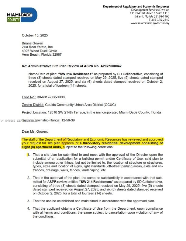 100% SITE PLAN APPROVED PROJECT. 8 all market rate units (can be sold as individual condos if desired) of 2/2's with 8 parking spaces. 8 inch water line/ 12 inch sewer abutting property and ready to connect no costly extensions needed. 2nd option for 25 units / 6 stories was approved in pre-app with the planning department if the buyer is interested. Blocks from the $1 billion redevelopment project Southplace City Center a "city within a city," featuring 5,000 residential units, 500,000 sqft retail, and a hotel. A lot of development in planning within two blocks (see photo). Not in a flood zone. Please email me for a copy of the full site plan. LOWEST PRICED PER SQ FT FOR THIS ZONING IN 33177 or 33170.