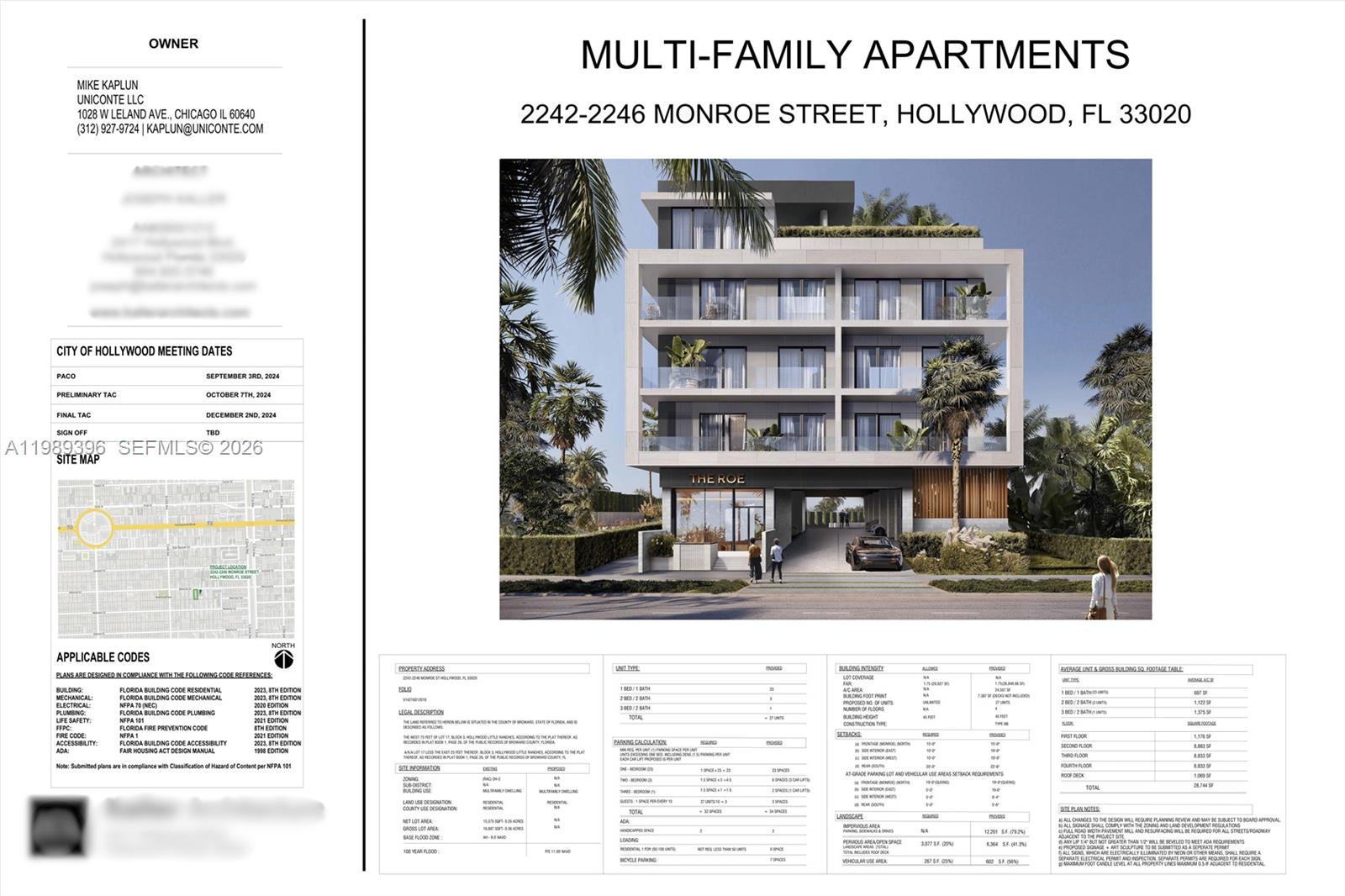 We are excited to present a rare development opportunity lot in the heart of Hollywood. This DH-2 zoned site is shovel-ready, with approved plans and permits for a 4-story, 27-unit multi-family building. The project comes with approved Plans and the Permit! With conventional financing, an investor could achieve: • Equity Multiple: 2.5+ • Gross Return: 155%+ The development plan includes: • Spacious 1, 2, and 3-bedroom units • Rooftop deck with open-air pool • Green space amenity with sun deck, BBQ area, and lounge zone • Fitness center • 34 covered parking spaces plus bicycle parking. Project and plans include 27 units total: 23 units with 1 bed/1 bath, 3 units with 2 bed/2 bath and 1 unit with 3 bed/2 bath. The site is just a 10-minute walk from Young Circle and an 8-minute drive to Hollywood Beach, offering excellent access to restaurants, arts, and transit. Project highlights: • Approved construction plans available • Full geotechnical investigation completed • Zoning and permitting confirmed for immediate build-out. Close with the permit in hand and start construction the next day!