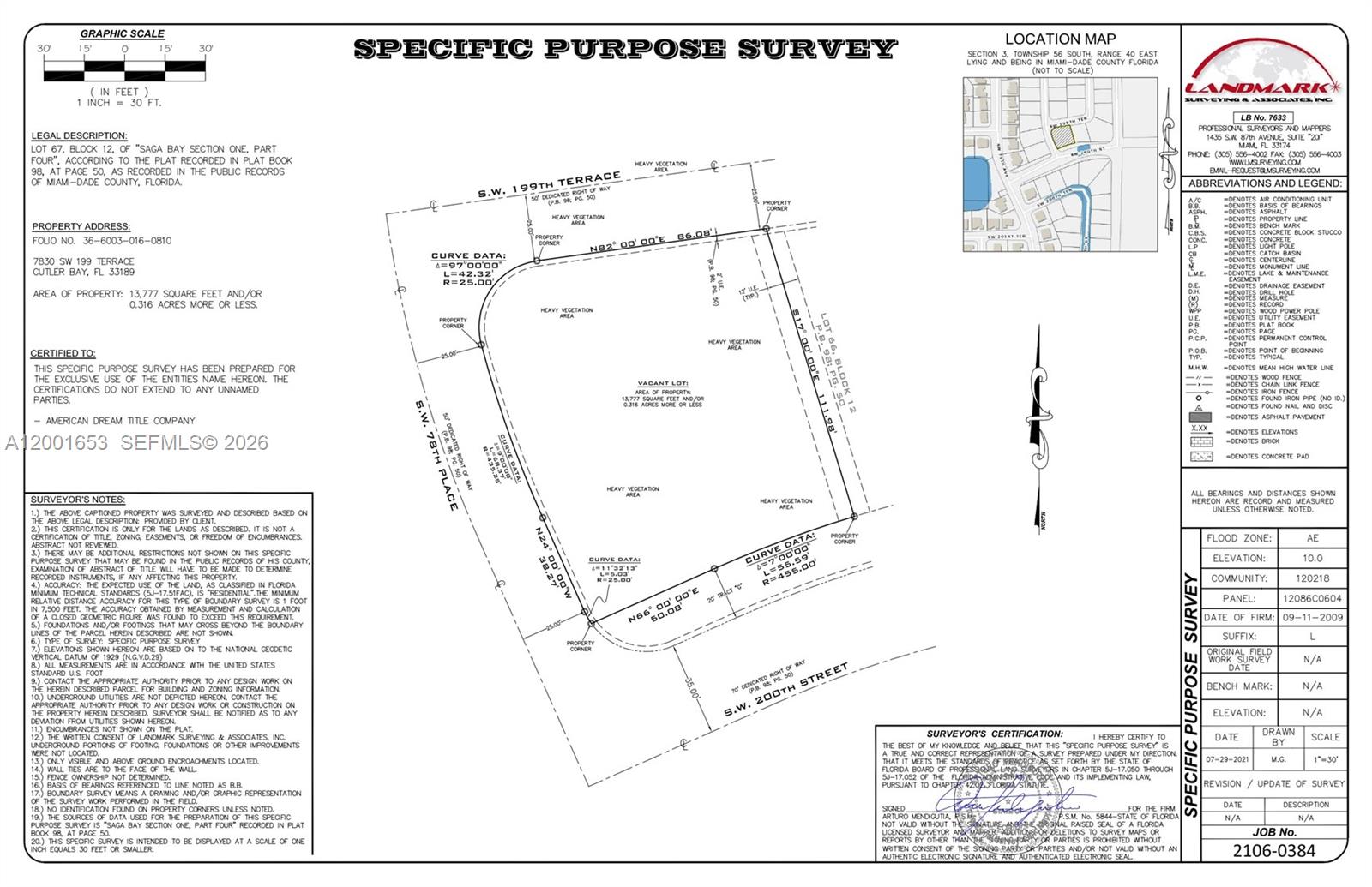 Rare investment opportunity to own vacant land in the prestigious Saga Bay community of Cutler Bay. This property offers the potential to build your dream home or hold as a future investment. Nestled in a peaceful and established neighborhood, it is conveniently located near top-rated schools, shopping, dining, and major highways, offering both comfort and accessibility. Priced to sell quickly. Additional properties also available for sale — MLS A12001744 7820 SW 199th Terrace and A12001775 7810 SW 199th Terrace. Don’t miss the opportunity to secure an exceptional piece of land in one of Cutler Bay’s most desirable locations. Buyers MUST perform their own due diligence. Buyers are advised to conduct their own due diligence, including but not limited to verification of location, lot dimensions, measurements, specifications, zoning, and allowable uses.