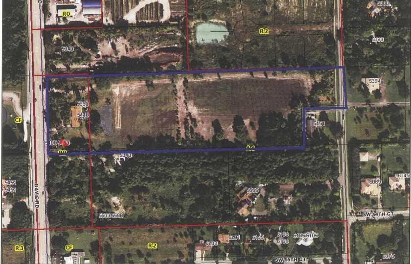 Development opportunity in an 8.9 acre vacant land. Lot has a single family home that can be rented while your project is designed and presented to the City of Davie. Mixed use zoning: Front side of the lot, facing Davie Rd, allows offices and residential density of 5 dwelling units per acre. Back side of the lot is agricultural and residential with a density of 2 dwelling units per acre (May qualify for 3 dwelling units per acre as included on Future Land Use Plan Map).