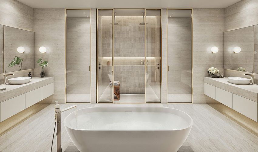 - главные ванные с полами и настенной плиткой из натурального камня, двумя раковинами, ванной и двойным спа-душем