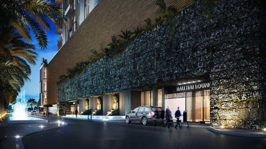 Несколько этажей, на которых располагаются удобства для резидентов, отгорожены от магистрали John F Kennedy Causeway каменной стеной в футуристическом стиле. Темно-серый фигурный кирпич украшают тропические кустарники с острыми листьями и витыми ветвями, становясь частью легко узнаваемого фасада Bali Hai.