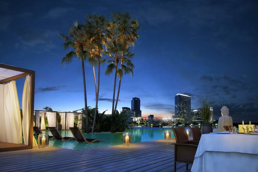 Эксклюзивная водная терраса бассейна выделяет Bali Hai из десятков элитных зданий Майами. Вся крыша нижнего блока, выступающая под кондоминиумом, превратится в сияющую водную гладь.
