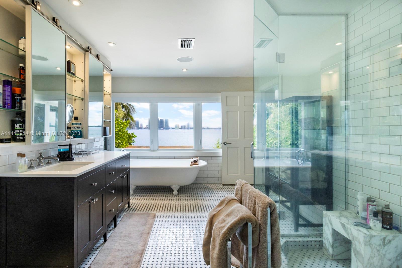 Stunning wide bay sunset views from this waterfront estate now available for rent on the coveted Venetian Islands! Sitting on an oversized 13,383 sq foot lot with over 103 feet of water frontage. This 6 bed / 6.5 bath home offers serene Biscayne Bay views of the iconic Miami skyline views. Features include media room with bar, spacious interior/outdoor living, hardwood flooring throughout home, marble fireplace, impact glass windows. Amenities include gated entrance, 2-car garage, a negative-edge pool, covered rear lounge seating, tropical front courtyard with Koi pond, jacuzzi, summer kitchen and lush landscaping