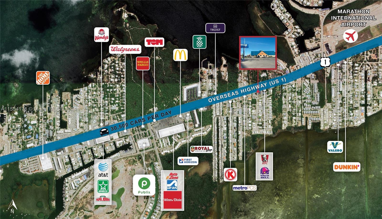 • 1.03 acres (45,000 SF) on Overseas Highway with 30,500 cars per day • Corner lot with ample parking space • In the center of Marathon • 3,088-SF former restaurant • Leasing rate: $180,000 per year • Next to Marathon International Airport • 230 feet on Overseas Highway