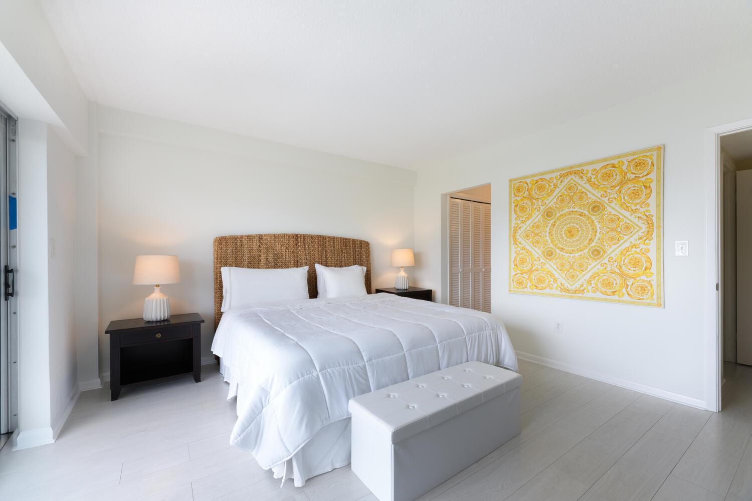 High floor, beautifully and comfortably furnished condo in ocean front, building within walking distance to Houses of Worship, restaurants and shops. Queen size bed in the bedroom and additional sleeper sofa(s) in the living room. Resort-like amenities include private deeded beach parcel w. chairs and umbrellas, large swimming pool, changing rooms, function room, gym, bicycle storage. Lushly landscaped pool area with many places to sit and enjoy. Full time manager and 24 hour doormen.