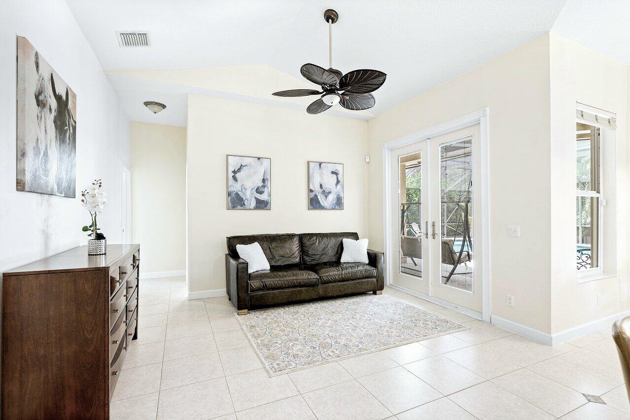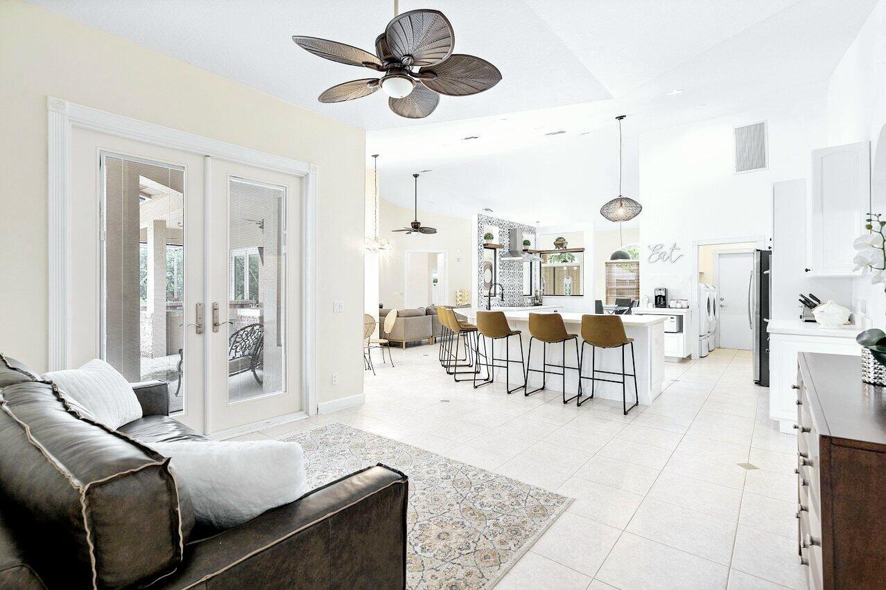 Incredible picturesque Corner lot just steps away to amazing park that leads to WEF path! Absolutely unparalleled in shortcut distance, this gorgeous property awaits you! With a floor plan that was masterfully designed for entertaining, the newly renovated kitchen, family room has gorgeous Bohemian tiles, glass with high end Carrara marble finishes to host guests & family! The massive counter bar space and eat in kitchen are so inviting and beautiful! So much pool fun with a solar heated, screened, enclosed pool and full, outdoor stone-accent kitchen to grill by Sunset views! Have awesome dinner parties and then get the golf cart and scooters ready for WEF, the path is unrivaled! Property has no HOA, Impact windows/sliders. Lg master suite w/access to Pool. $6.8k offseas, $12.2 seasonal