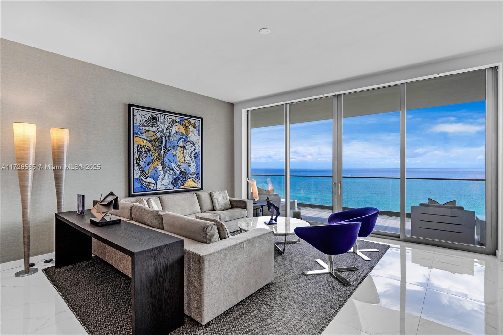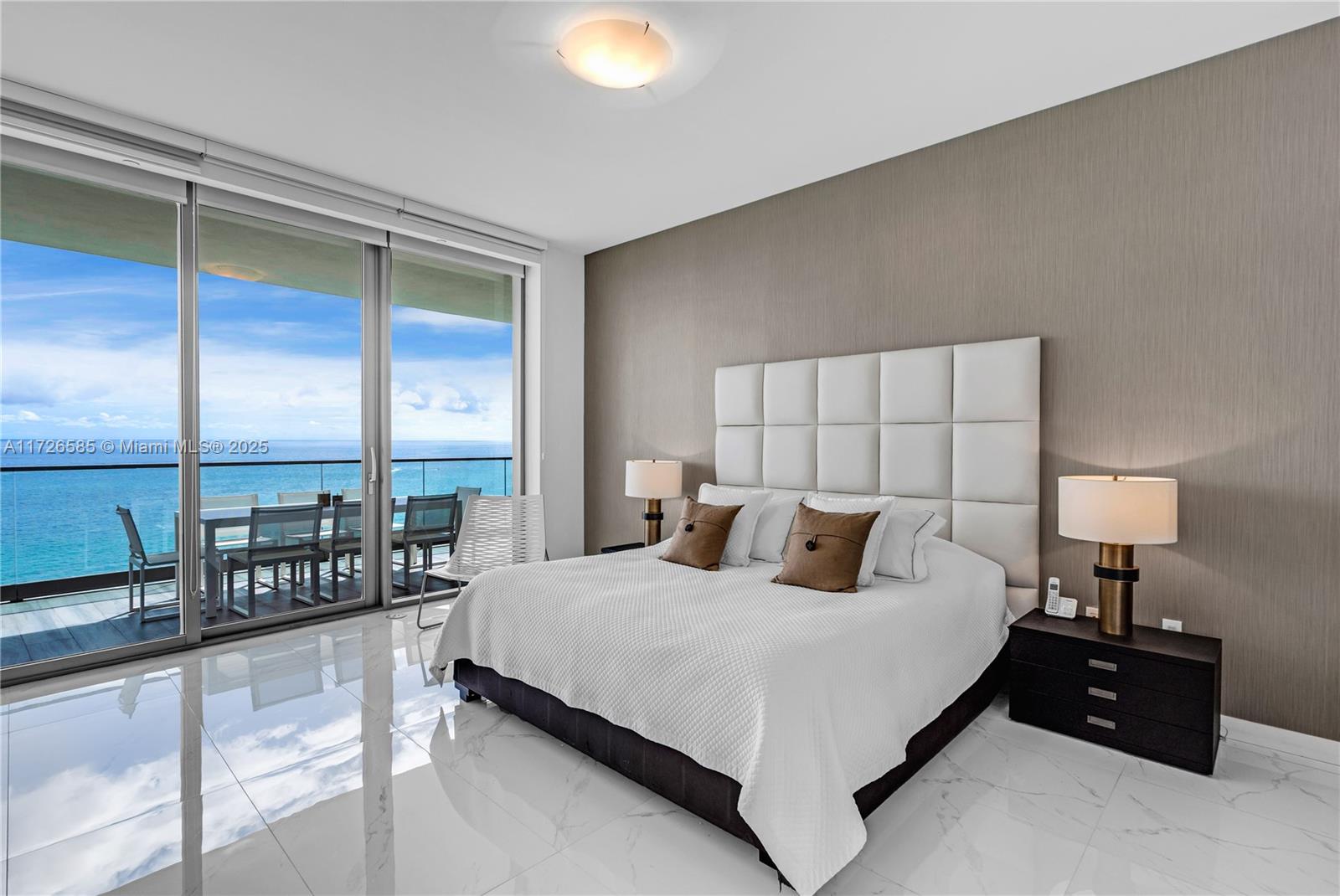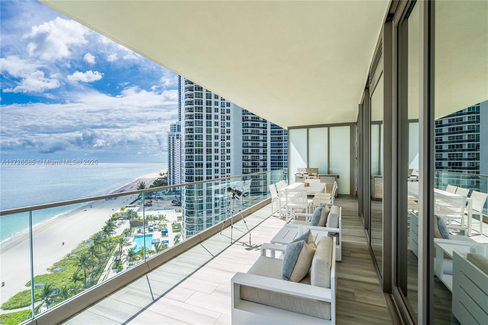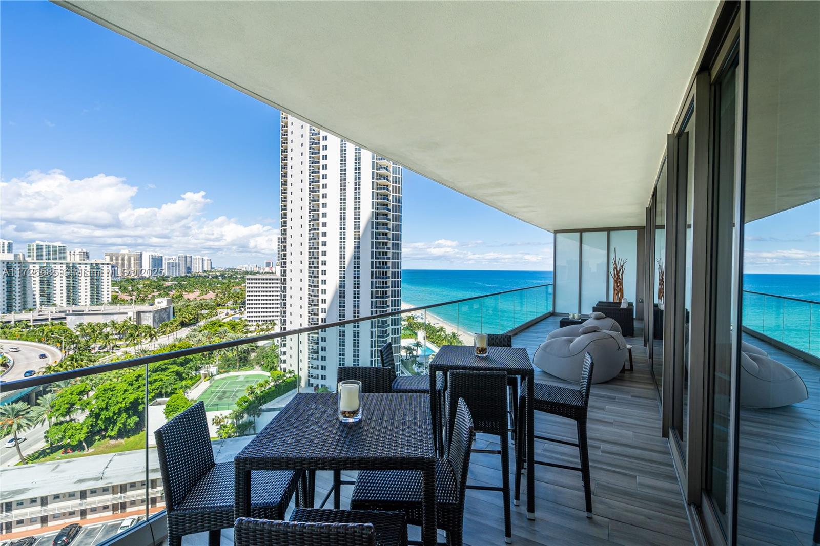 Exquisite, fully furnished by renowned interior designer, flow-through unit at the exclusive beachfront Armani Casa. Private elevator leads you to this spectacular 3BR + Den, Staff quarters and 5.5 baths. Floor-to-ceiling windows and expansive terraces throughout encompass beautiful direct East and West views with built-in summer kitchen on the beach side. Blackout and sheer shades in bedrooms and custom-built closets. Armani Casa features state-of-the-art amenities such as restaurants, bar, beachfront pool, business center, spa, fitness center, theater room, cigar and wine room, children's play area, security, concierge, and valet parking. SHORT TERM RENTAL ONLY