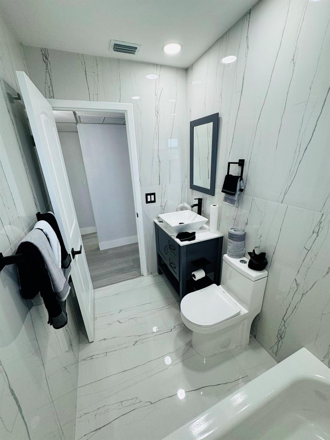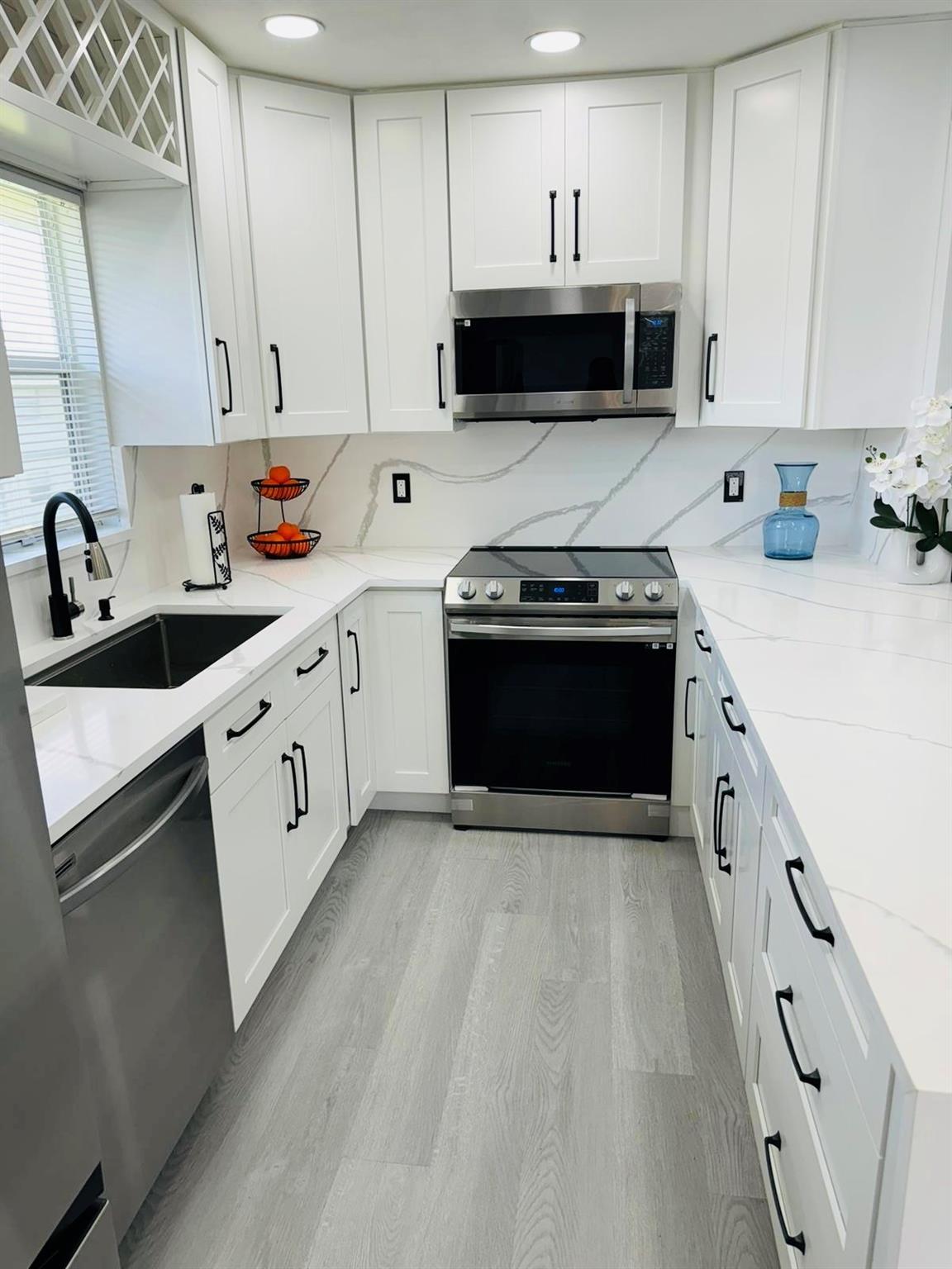 Discover your ideal home in a great 55+ community: a luxurious 2-bed, 2-bath unit on the second floor. The kitchen is a culinary masterpiece with stainless-steel appliances, quartz countertops, and an inviting island. The open-concept design, enhanced by numerous windows, floods the space with natural light and offers stunning garden views. Enjoy modern bathrooms with frameless showers and rainfall systems. Fresh paint and new luxury vinyl floors create an elegant ambiance. Community perks include a clubhouse, indoor/outdoor pools, and tennis courts. Located near the ocean, this move-in ready home features a 2020 AC, a new 2024 water heater, and includes a washer and dryer. Conveniently, the pool, laundry room, and dumpster are just steps away.