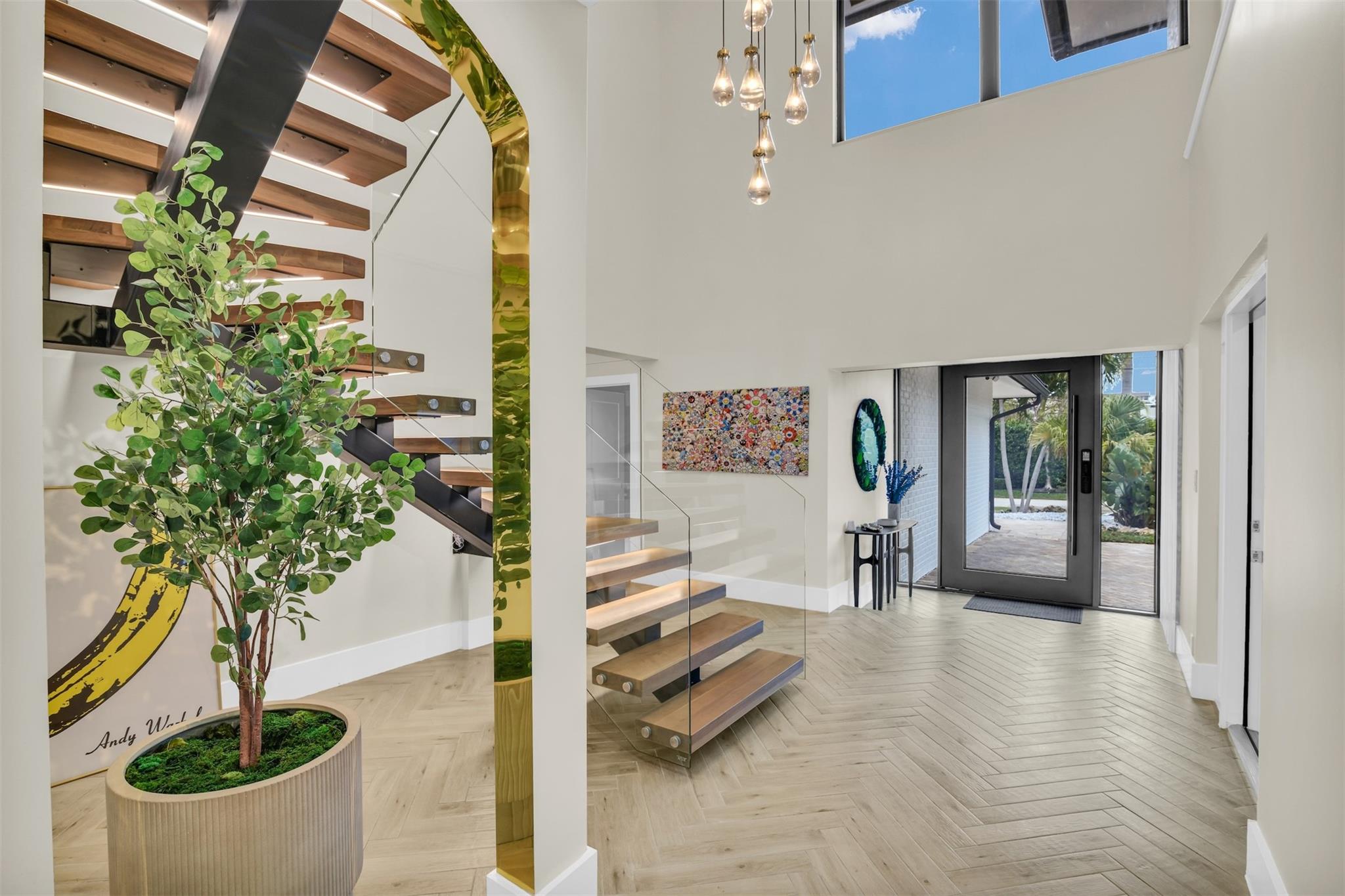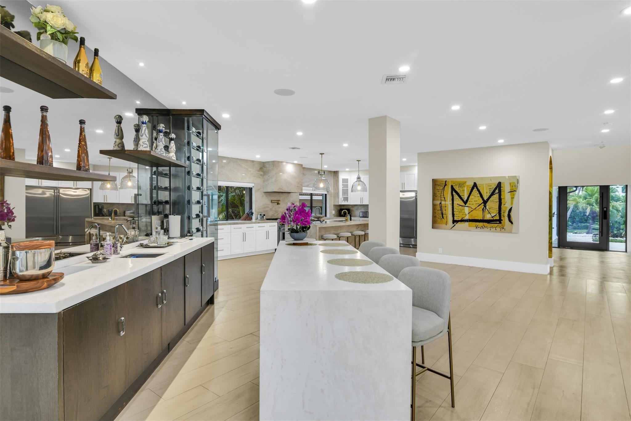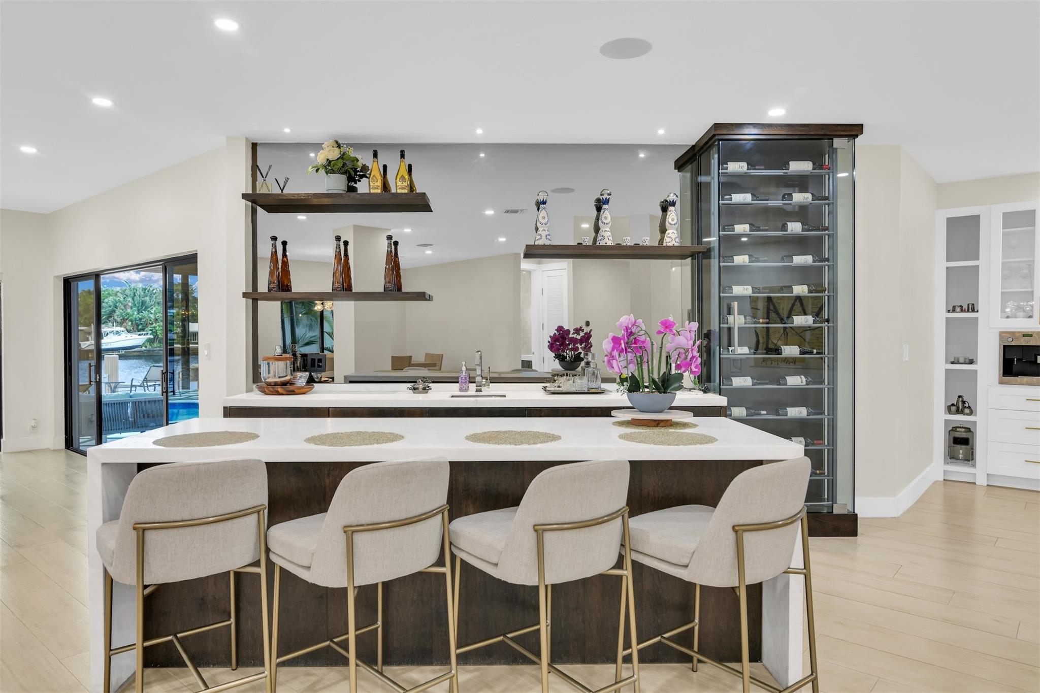 Stunningly remodeled, intracoastal front 6 bedroom, 6 bathroom home ready for you to move in. Every inch of this property as been transformed with the finest finishes. Beautiful foyer welcomes you into this 5,196 square foot masterpiece. Chef's kitchen is dressed with Cristallo Island, SubZero refrigerator and freezer, Wolf range, and wall espresso machine. The wet bar with wine cooler leads you to your open family room and formal dining room with incredible views of the intracoastal waterway. Summer kitchen for entertaining at your gorgeous pool overlooking 60 ft. dock. Fully equipped theater room + separate office on the first floor. Second floor has very large loft and coffee bar along with a fireplace. Primary bedroom boasts water views and extra large shower with dual shower heads.