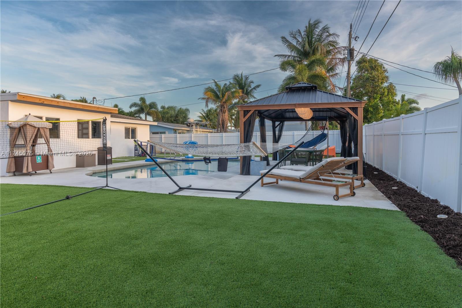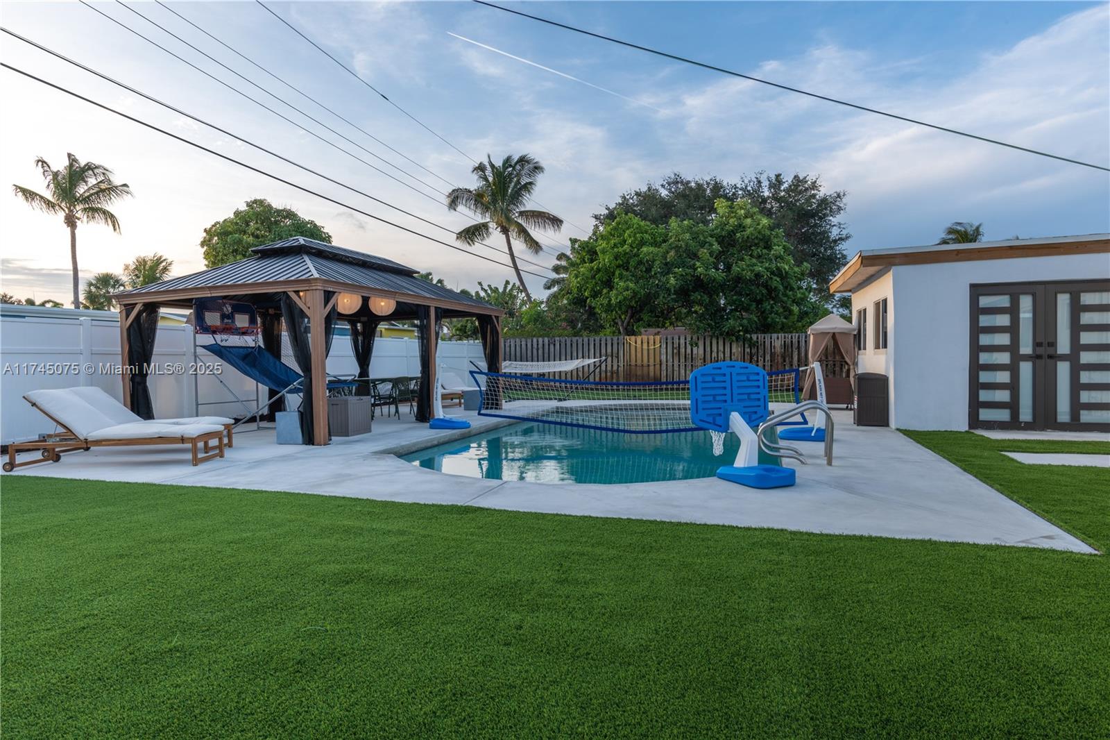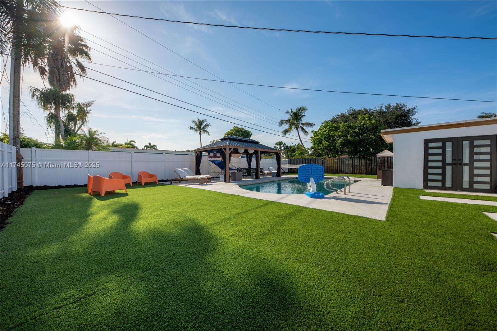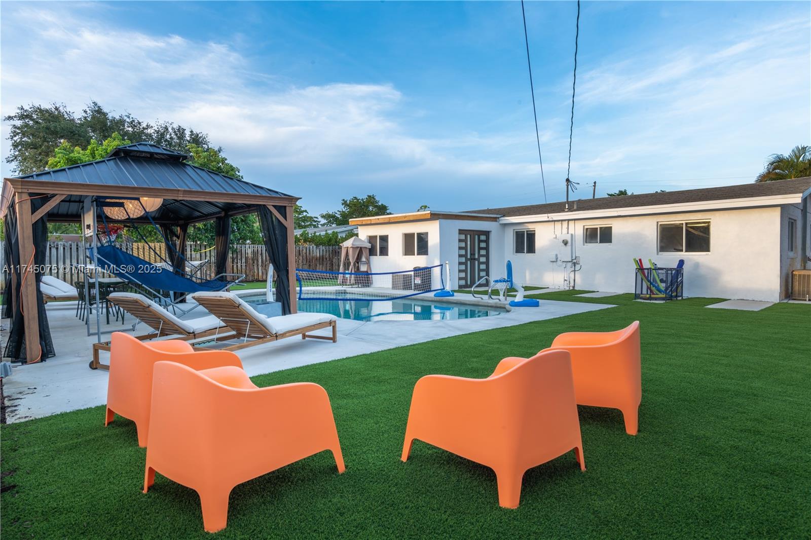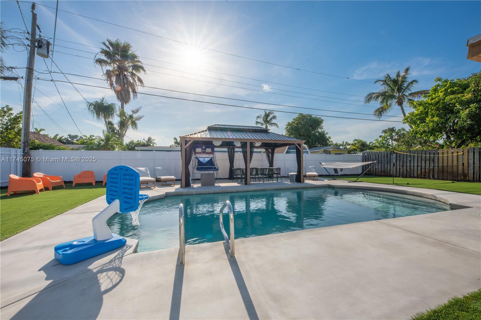 See Virtual Tour. You will definitely enjoy your stay in this fully furnished home located in a great neighborhood only 6 minutes to everything beautiful Deerfield Beach has to offer. The ample backyard offers plenty of space and games to entertain and for the kids to play while enjoying the sunset from the pool. The home features a circular driveway with room for a boat or jet skis, all impact windows and doors, updated floors and bathrooms, new washer and dryer, new indoor and outdoor furniture, new gazebo, new synthetic lawn throughout the backyard, new TV's in every room, and a very well-equipped gym.