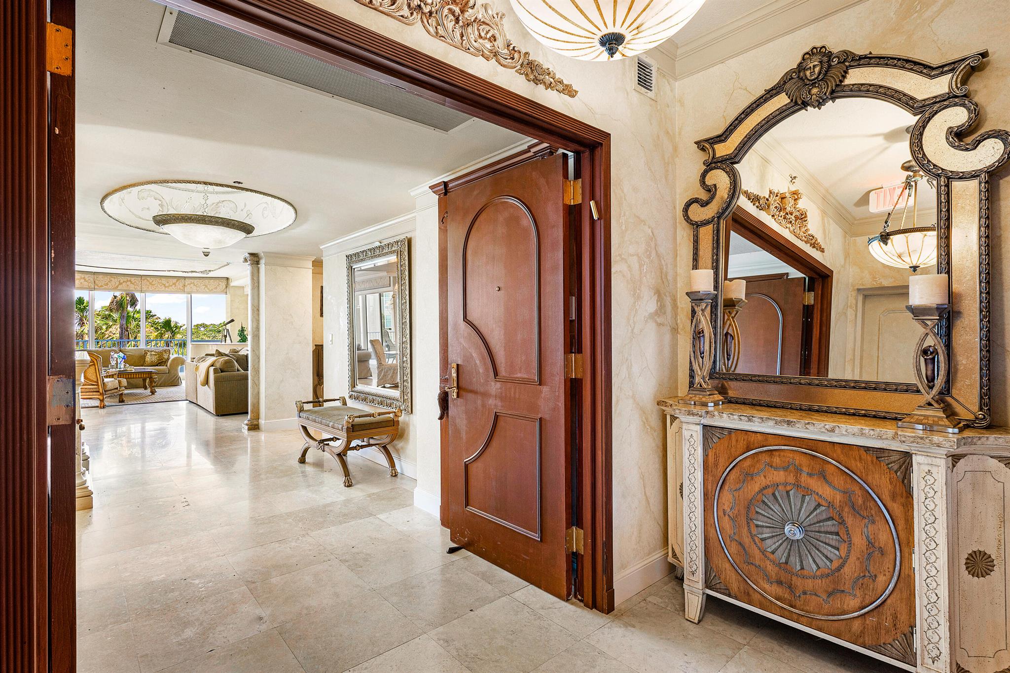 Enter this grand 3 bed, 4 bath corner unit from the elevator into your private vestibule. This luxurious property features a gourmet kitchen, marble floors in the large and open living areas, 9' ceilings, expansive primary bed and bath, and a 2000 SF balcony with sweeping resort views and stunning sunsets over the inter-coastal. All bedrooms are en-suite and have large walk in closets. You can relax, entertain, and re-energize in this beautiful designer appointed Unit. In one of the most prestigious communities in Highland beach, you will enjoy all the benefits of the Toscana Lifestyle including full service concierge, valet, a private beach club, tennis, resort style pools, business and fitness centers, and so much more. Exclusive, luxurious, and private.