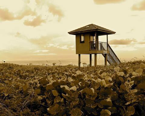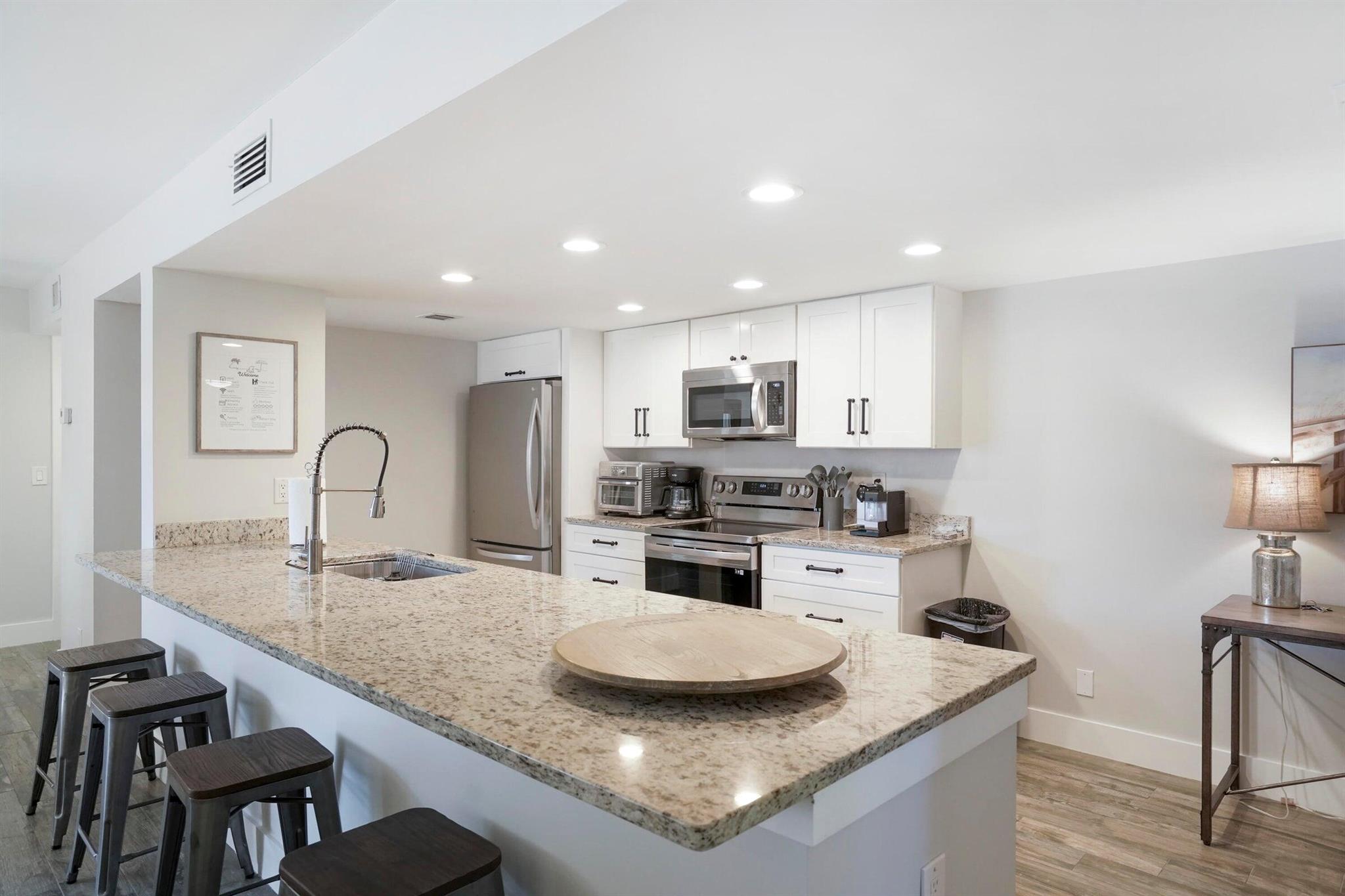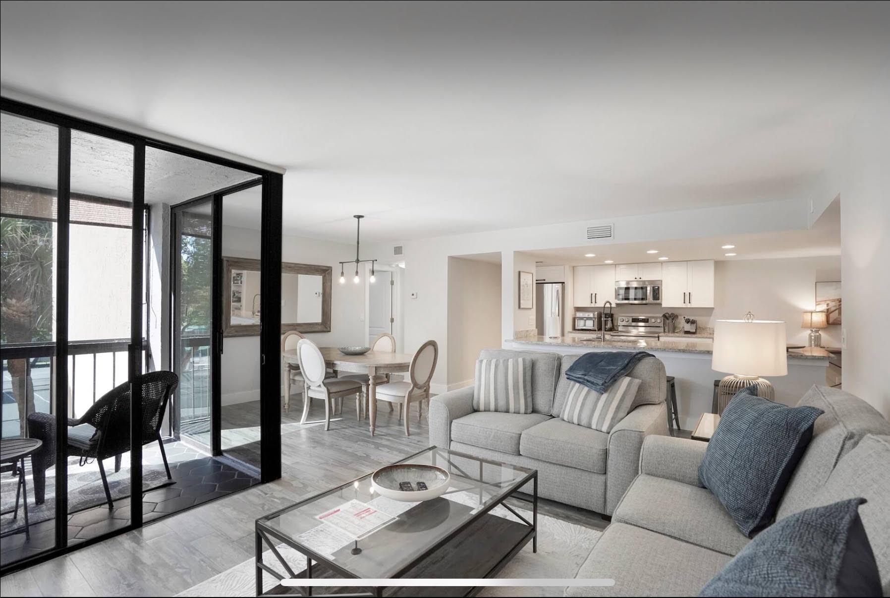 This completely renovated unit features a modern beach/coastal design with new porcelain driftwood plank tile flooring throughout, adding a rustic yet sophisticated touch. The King Master Bedroom with Ensuite boasts elegant coastal decor and a new LED TV. A split floor plan offers privacy for the 2nd Bedroom, designed with a tranquil beach theme perfect for any guest. The remodeled kitchen showcases white shaker cabinets and beautiful countertops, creating an open concept ideal for entertaining. Enjoy the screened-in balcony overlooking tennis courts. The community offers a pool, hot tub, fitness center, and tennis courts.