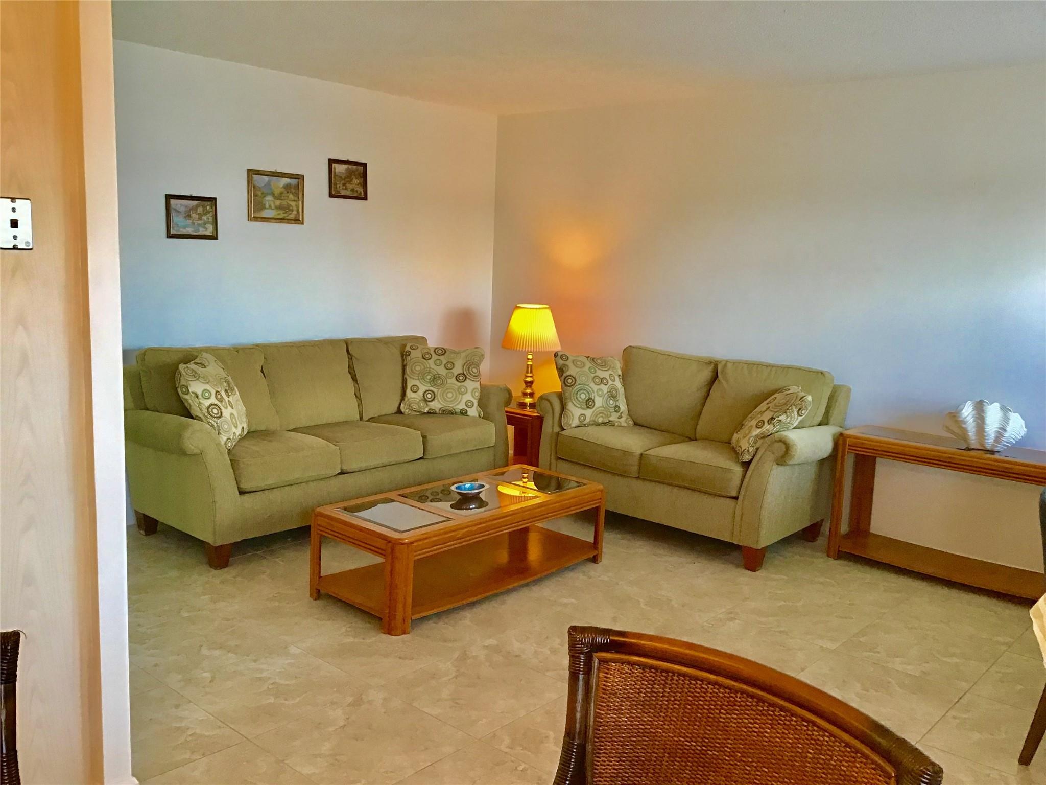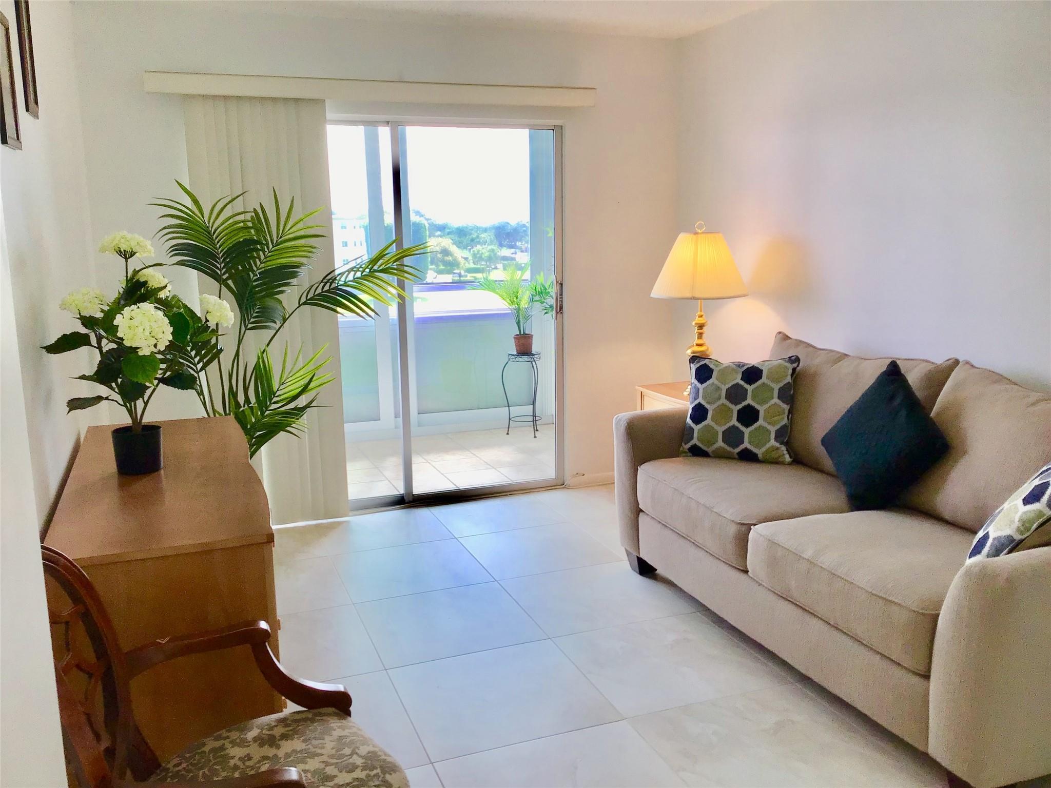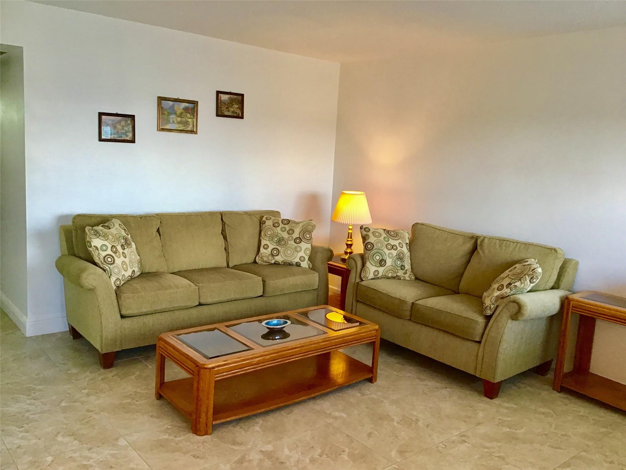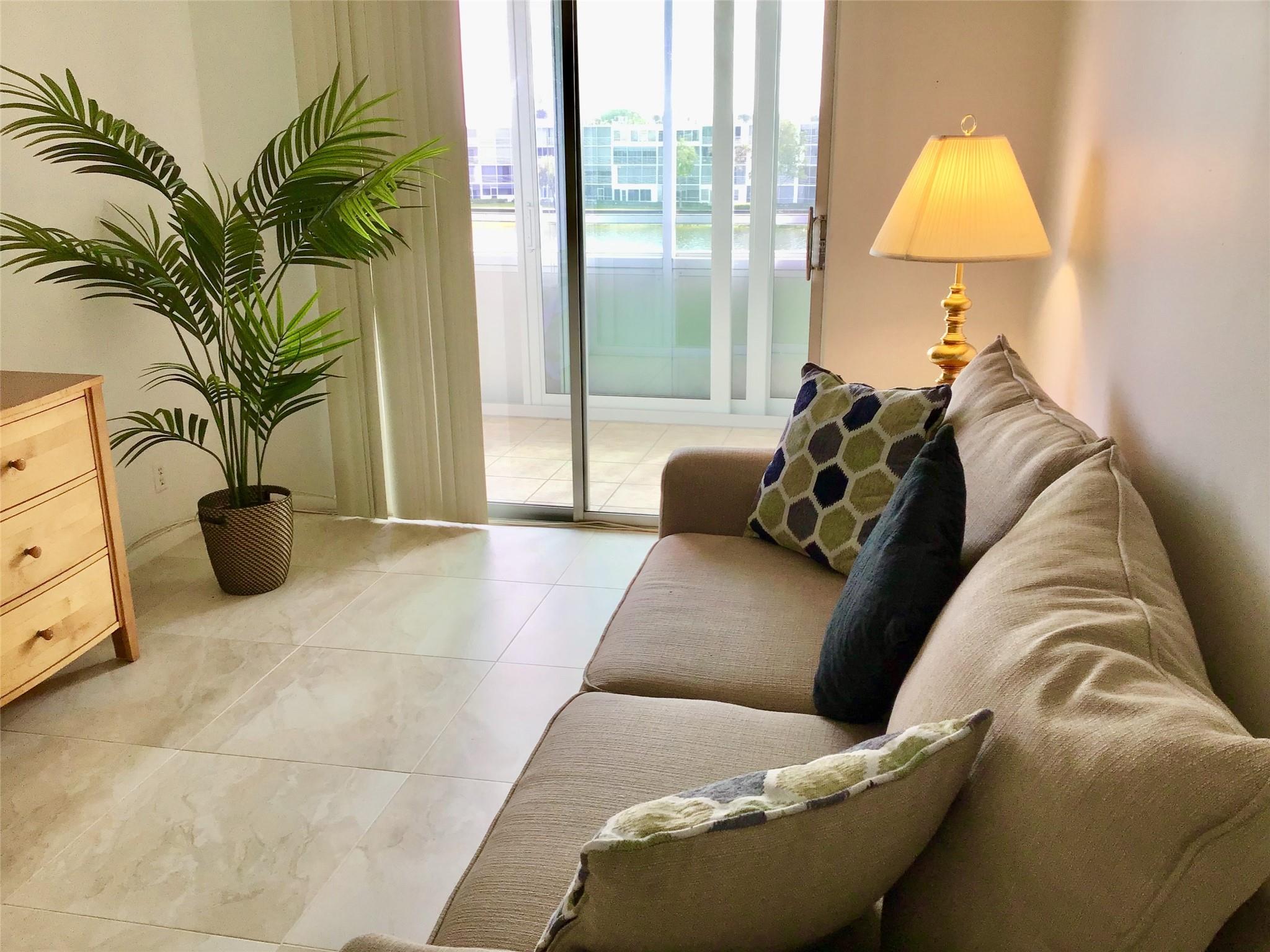 Furnished 2 Bedroom, 1.5 Bath Condo on the 4th floor with Panoramic Water Views is available for Annual Rent. Features an updated Tile flooring throughout the unit, Nice walk in shower, Good size Balcony with Hurricane sliders and much more. 2 minute walk to the pool. Comes Fully Furnished. Century Village is a Gated Active Adult 55+ community with amazing amenities including a Clubhouse with a Gym, 2 Olympic size pools(Indoor and Outdoor), Movie Theater, ping pong, Billiard, card rooms, Tennis courts, Biking and Jogging lanes, Concerts, Daily activities and Much more. Cable/Internet, water/sewage, garbage removal and much more is all included in the rent. Tenant pays only electric. Has an assigned parking spot with Plenty of Guest Parking available. First, Last and Security to move in.