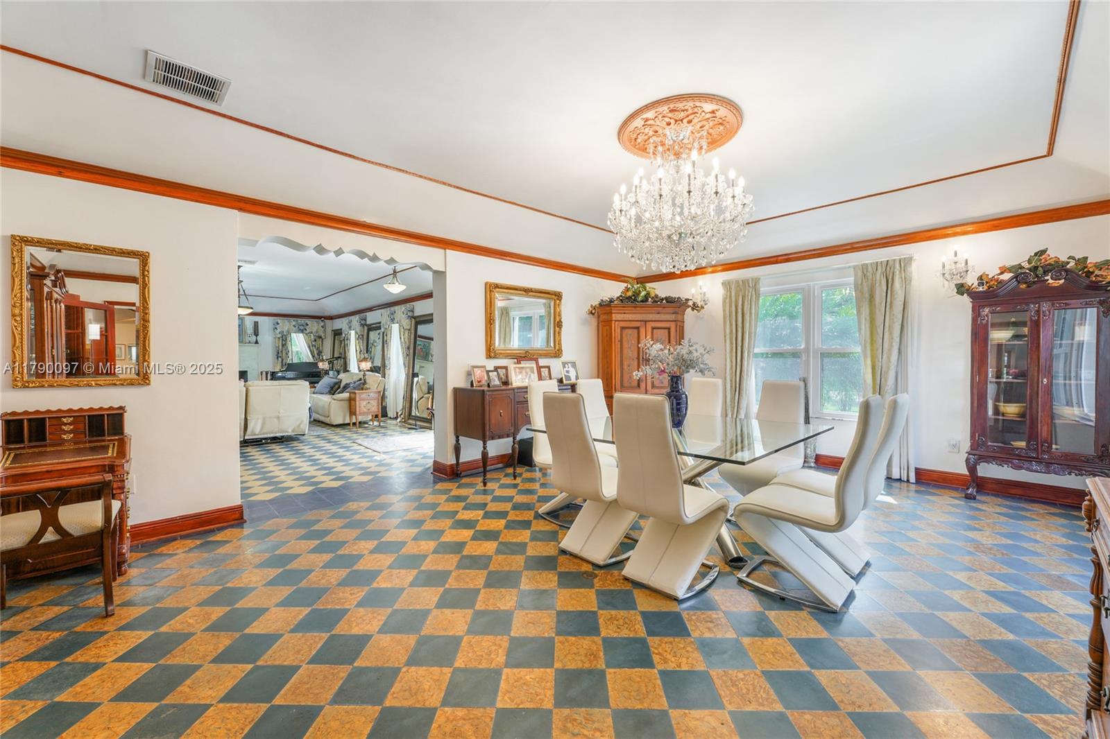 Quintessential Miami Shores Mini-Mansion Designed by Walter De Garmo. This beautiful single-family residence blends timeless architecture with modern comforts. A light-filled entryway opens to the expansive great room, featuring high ceilings, elegant wood beams, and a cozy wood-burning fireplace, perfect for gatherings. Hardwood floors, plus impact windows, provide comfort and efficiency. The kitchen is a chef’s delight with gas cooking, granite countertops, and SS appliances. Features include a versatile nanny room and a fenced backyard ideal for entertaining or relaxing outdoors. Private Parking for 4-6 vehicles in the back Carport. This large home offers a unique opportunity in one of Miami’s most sought-after neighborhoods, just a short walk to restaurants and shopping.