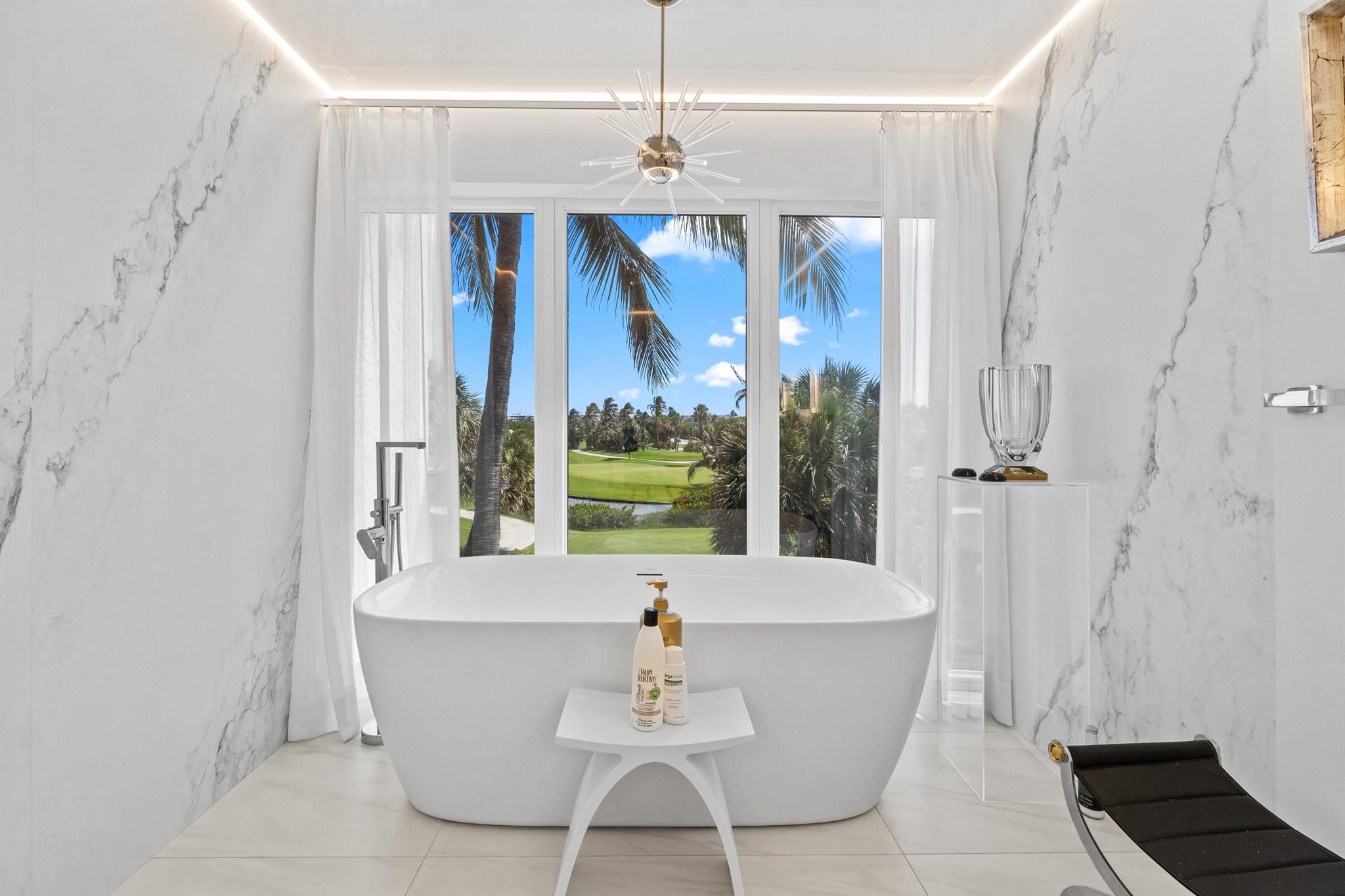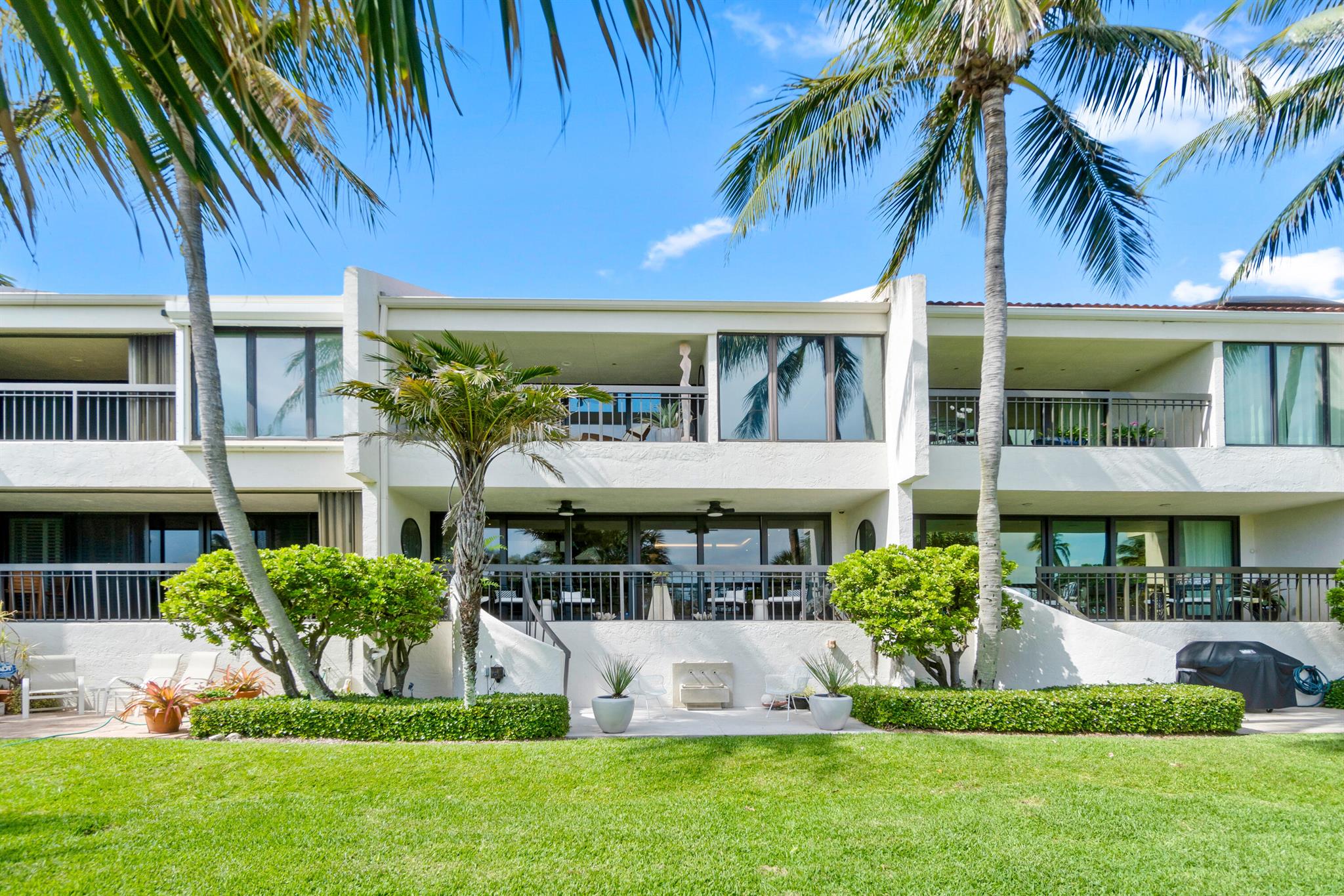 Sun-filled southern exposure with stunning views of the Palm Beach Par 3 Golf Course, Intracoastal, and Ocean. This modern 3BR/2.5BA home is fully renovated and professionally furnished to perfection. Features include a high-end kitchen with sitting area, spacious living and dining rooms, and a terrace leading to a private garden. An elevator connects all levels from the 2-car garage to the top-floor bedrooms. The primary suite offers soaring ceilings, a private terrace, spa-like bath, and generous closets. Two additional bedrooms, a full bath, and laundry complete the upper floor. Tres Vidas offers a manned gate, tennis court, and deeded beach access. Next to Palm Beach Par 3 Golf Course and Palm Beach Tennis Center. Minutes to Worth Avenue and top resorts.