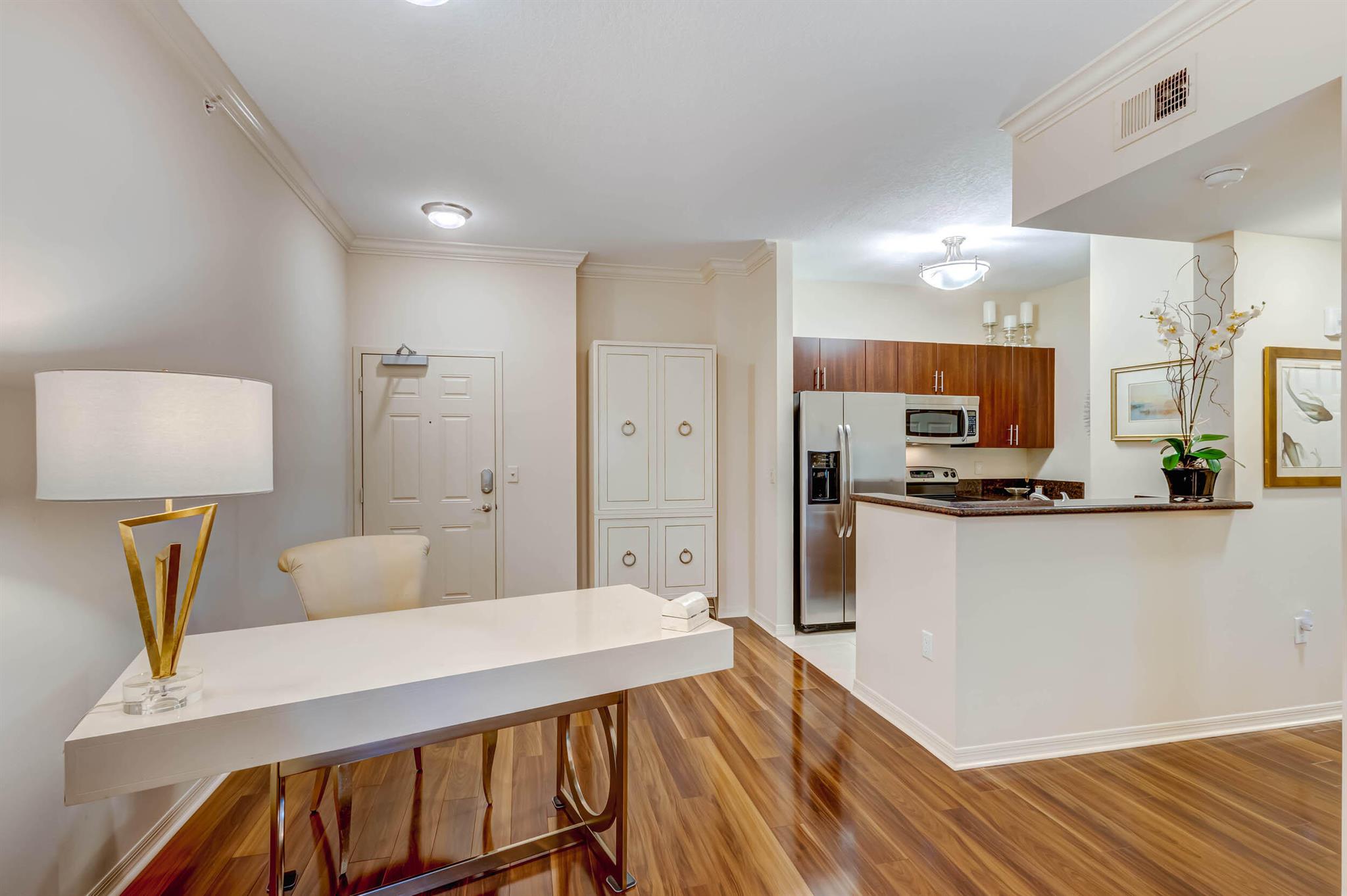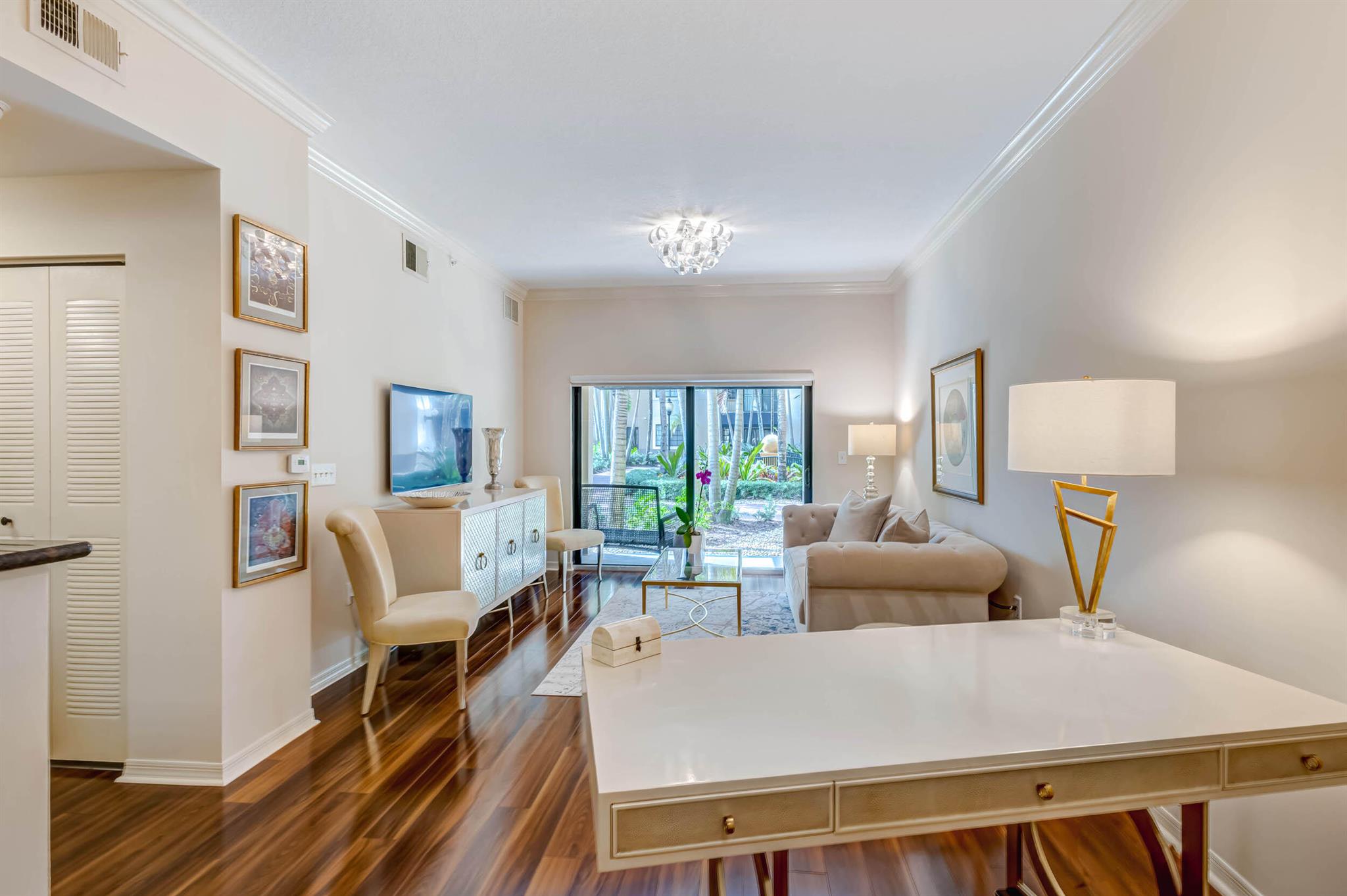 PGA Blvd Seasonal/Executive 1bedroom, first floor rental, Seasonal rental available November 2025-May 2026. 120 day minimum lease. Non Smoking building. Seasonal lease is paid in advance. Taxes and Liability policy also required. A Longer lease is possible. Private courtyard Corner unit attached to parking garage. Fully turnkey and contemporary designer furnished condominium in charming and walkable Residences at Midtown. Shops, dining, and Publix right outside your door. 5 minutes from PGA National Resort and 10 minutes to the beautiful beaches of northern Palm Beach County. Gated community with 1 reserved space. Keypad door entry. Rent includes all utilities, internet, cable, and cleaning service every other week. Master bedroom has 1 king bed and a large closet. Fresh market nearby