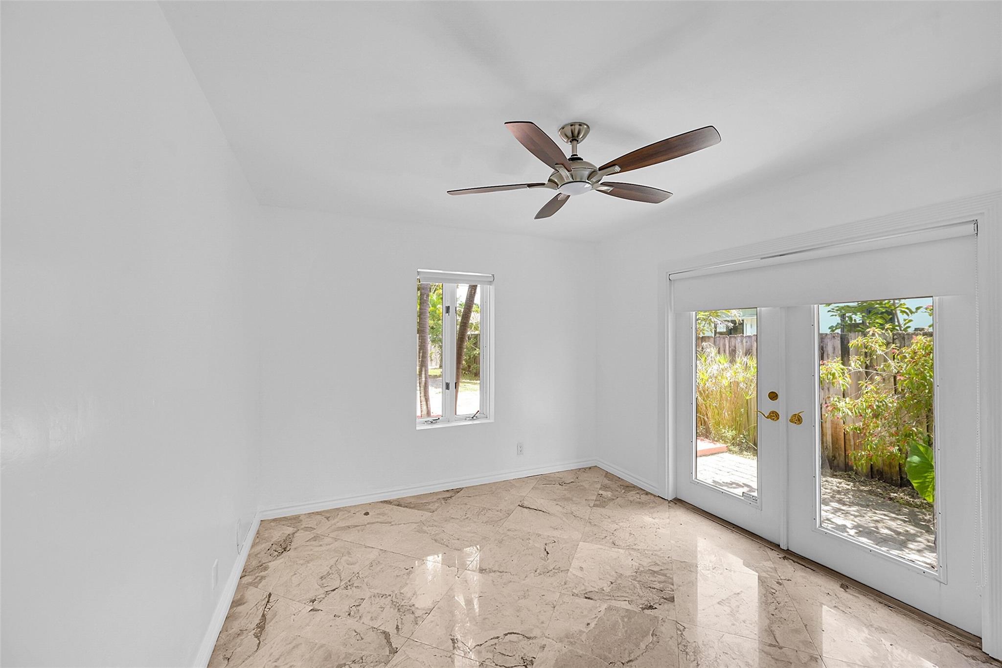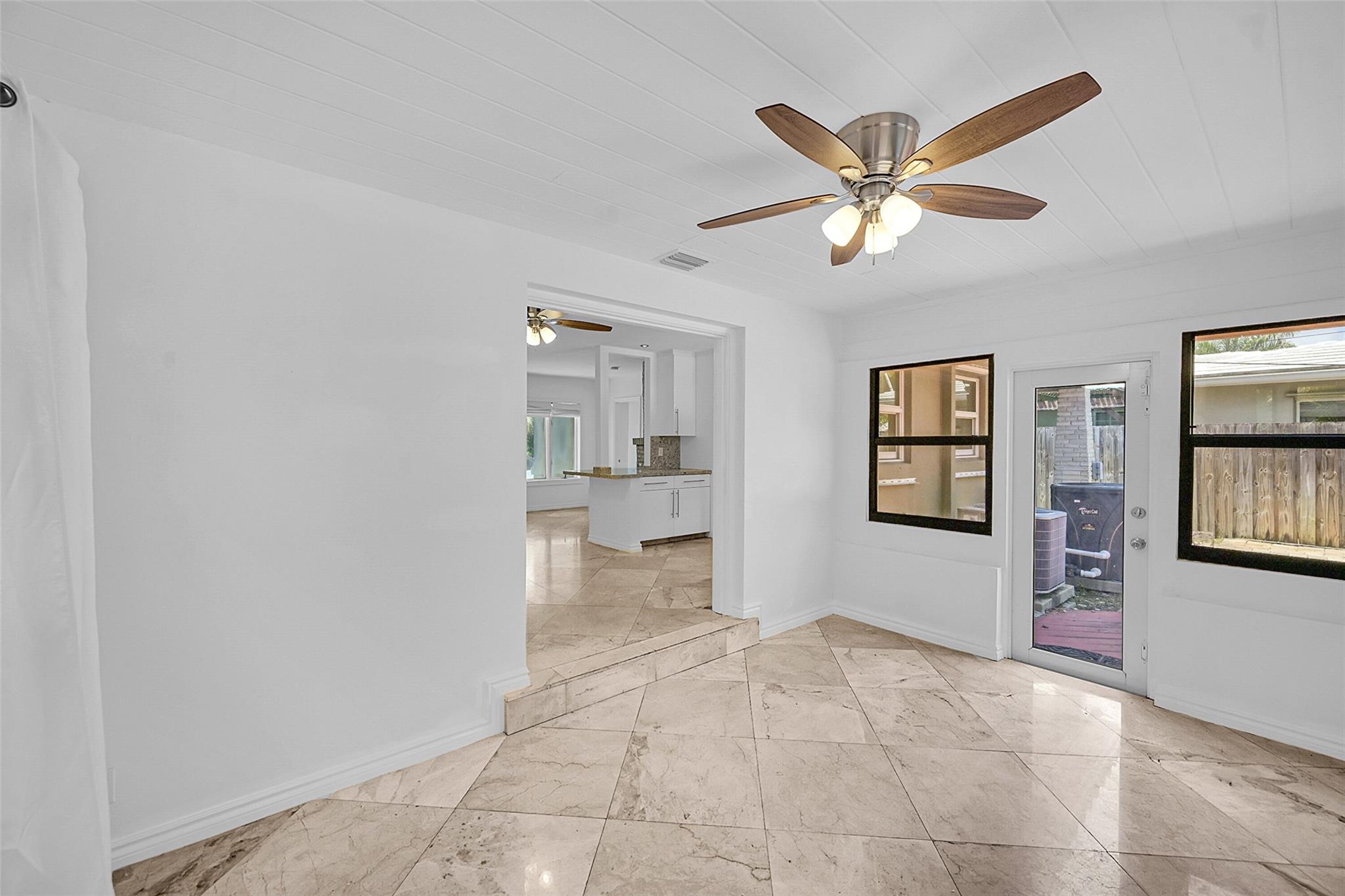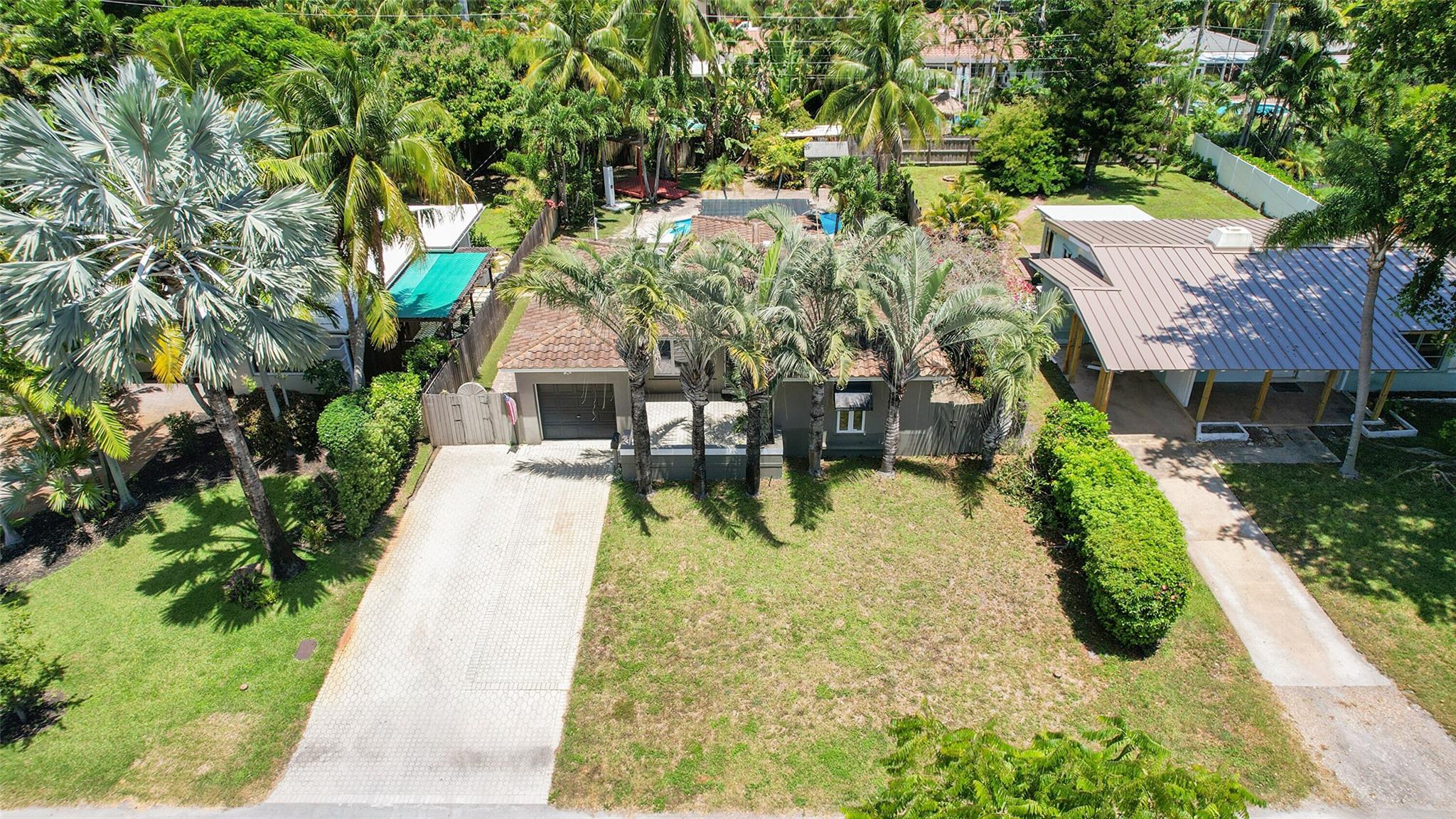 This beautiful home is located in Poinsettia Heights area of Ft Lauderdale. Enjoy the views of the large tropical backyard pool area. This three bedroom, two bath home has marble floors, renovated kitchen and baths with step- in showers. Bedrooms all have access doors to the yard. Yard has wood covered deck for out door living. The garage has been converted into third bedroom. Pool is heated.