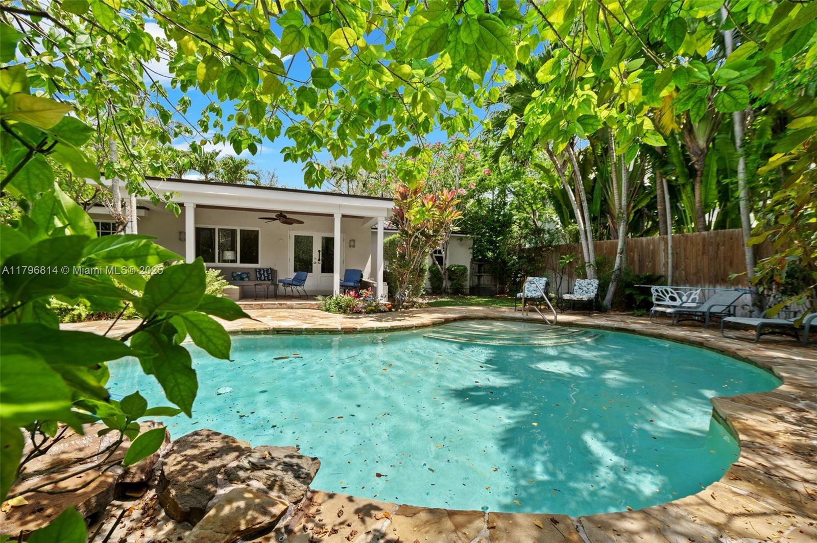 SHORT TERM RENTAL ONLY– This South Coconut Grove gem sits on a quiet, tree-lined street and offers 3 beds, 2 baths + OFFICE. Enjoy a heated saltwater pool with waterfall, surrounded by native plants and butterflies. Features include impact windows, formal living room, family room, and open kitchen. The primary suite has an en-suite bath, walk-in closet + extra closet. Serene, light-filled interiors with views of the lush garden and pool. Driveway fits 2 cars, with ample street parking.