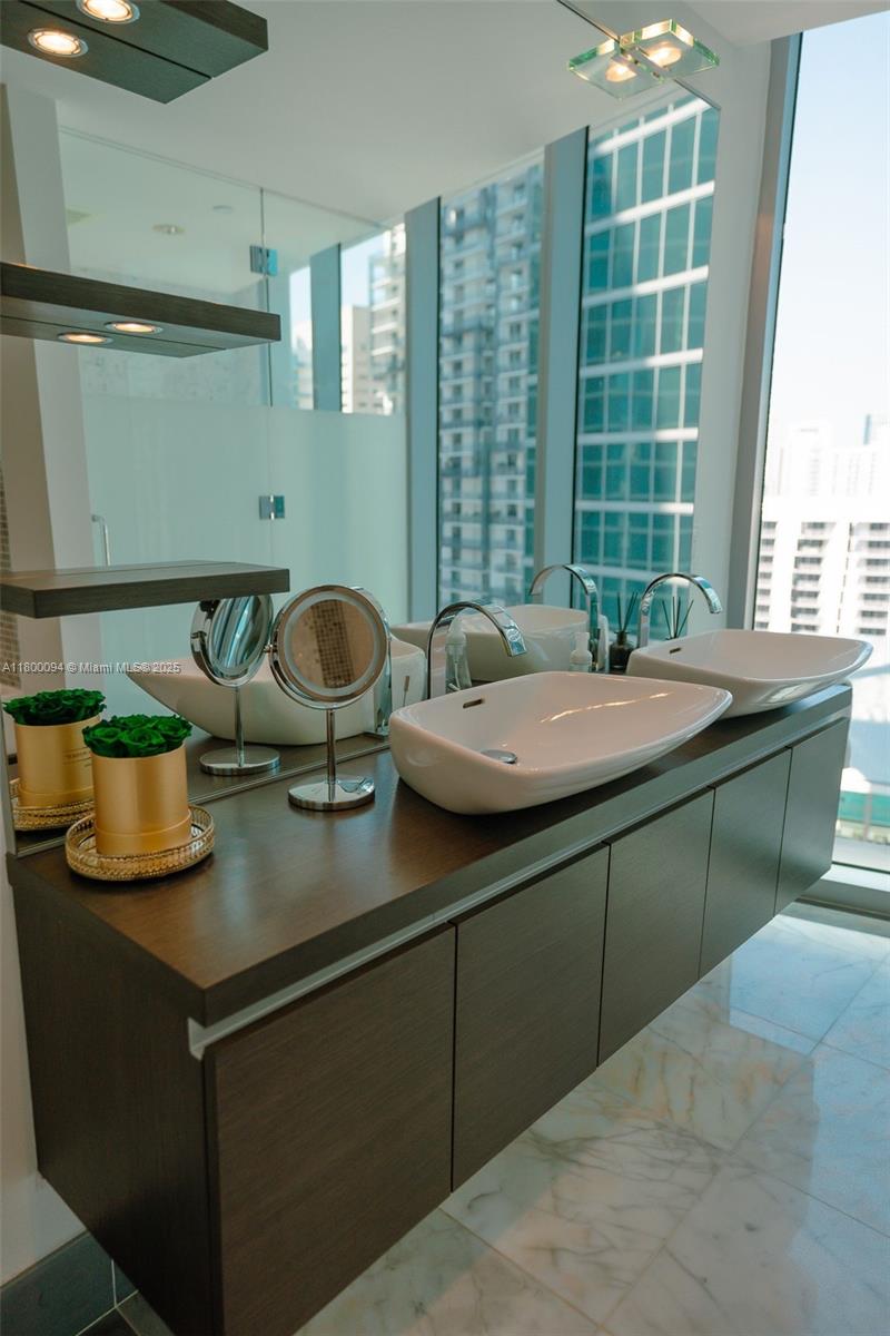 Located in one of the Finest Luxury residences in Downtown ,This unit is Spacious and bright 2 bedrooms with 2.5 bathrooms with floor to ceiling windows, and 3 balconies (an oversized 280sq ft balcony off the living room, and a private balcony in each room) It offers 180° views of ocean, bay and city. Primary suite with extra large walk-in closet, jet bath tub and shower, top-of-the-line finishes, porcelain flooring throughout and marble in the bathrooms. Unit is in perfect condition. Enjoy the famous Miami happy hour by the infinity pool and high end restaurants such as Zuma, and Area 31. Sophisticated amenities include Exhale fitness center & spa, 2 pools, 24h concierge and marina access. Unit includes 1 parking space inside garage, additional cars to be valet.
