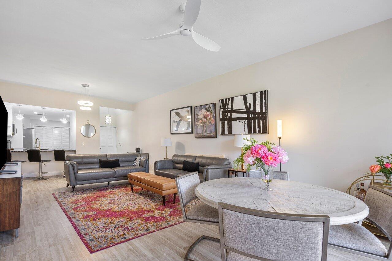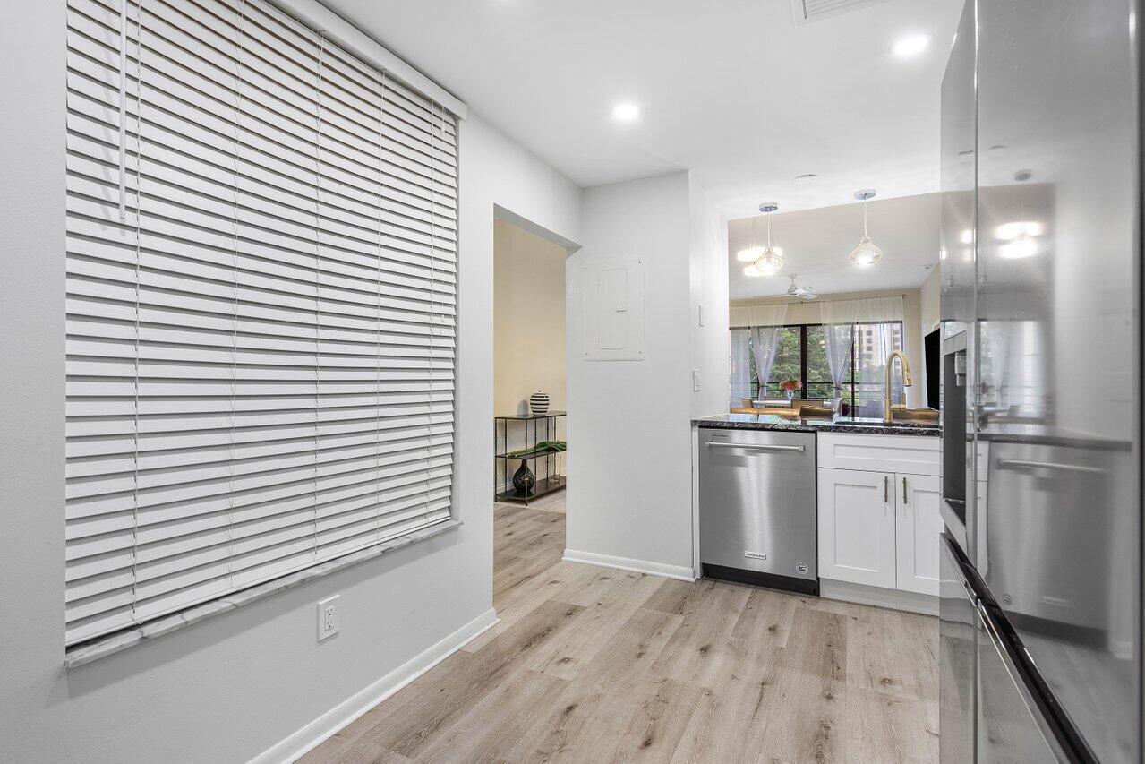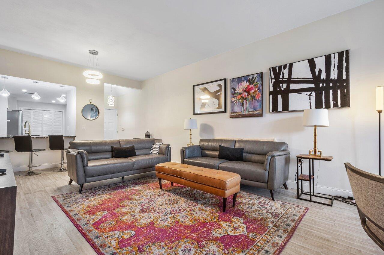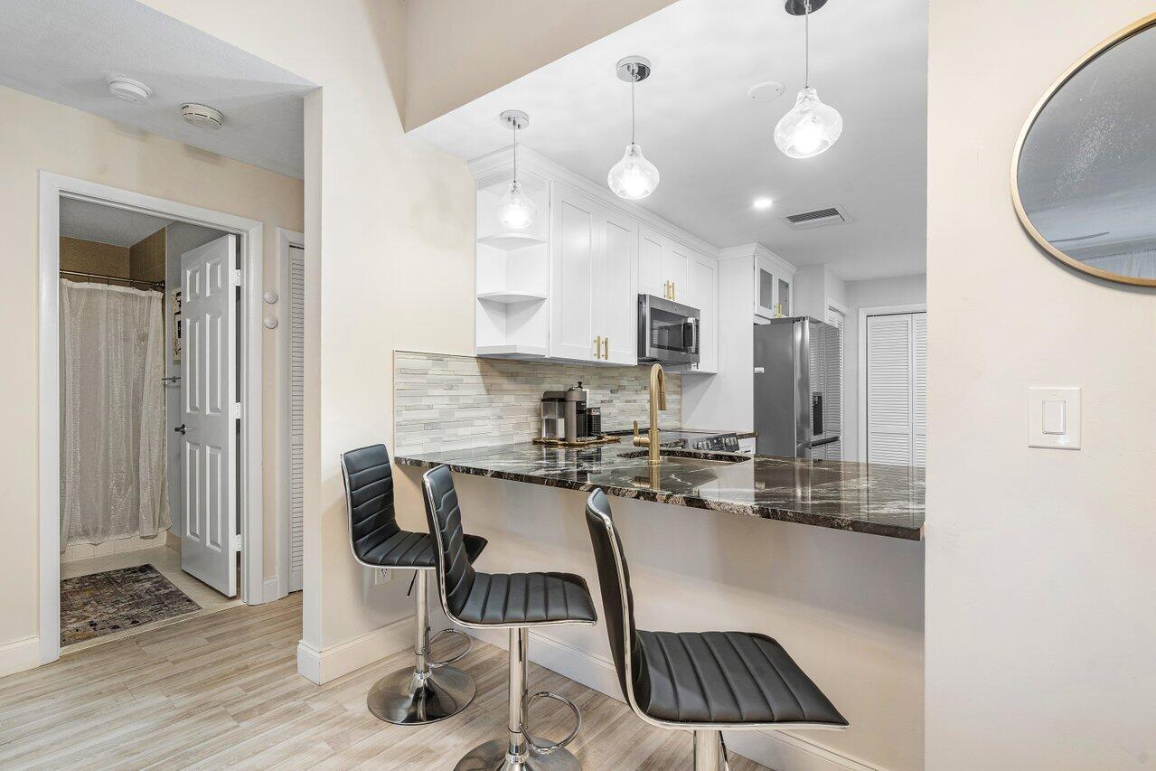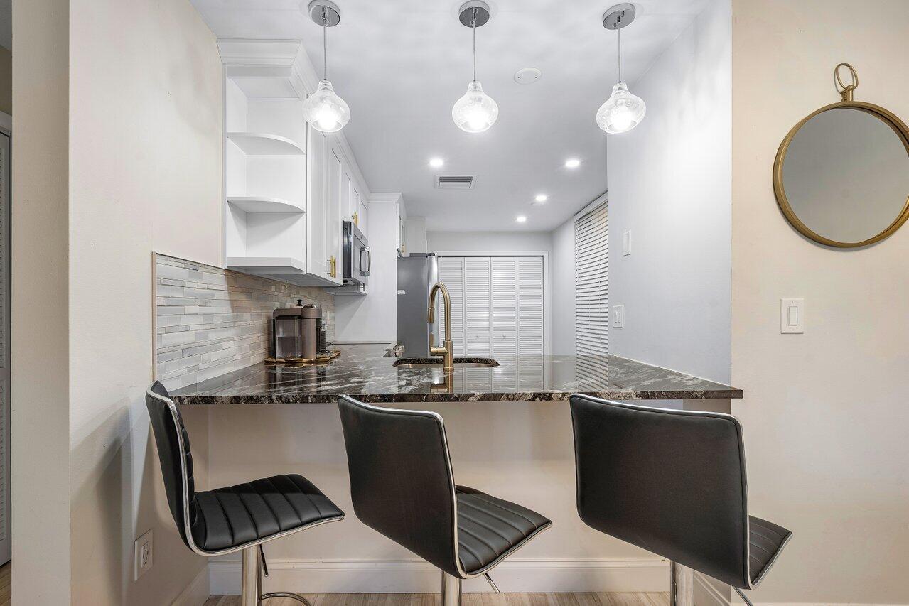 Discover the perfect blend of elegance and comfort in this beautifully designed and renovated 2-bedroom, 2-bathroom condo, located in the prestigious Boca Pointe community. This stunning home features a thoughtfully designed split floor plan, ensuring privacy and convenience for all. The homes features a brand new A/C unit and hot water tank and newer kitchen appliances (2022) Step inside to find a bright, airy living area with updated laminate floors that seamlessly flow into a modern kitchen. The kitchen is a chef's dream, complete with stainless steel appliances, sleek finishes, and dramatic black and white swirl granite countertops. The expansive bar island provides additional seating, making it an ideal spot for entertaining or casual dining.