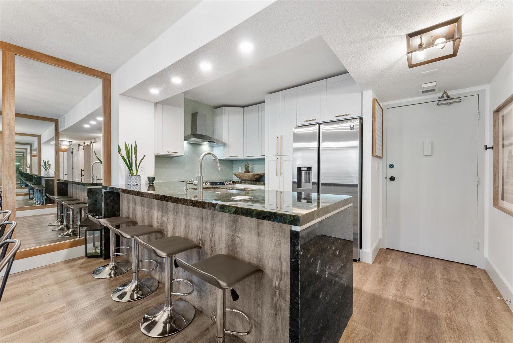 Step into effortless luxury in this fully furnished 1-bedroom, 2-bath boutique, oceanfront condo building in South Palm Beach. Originally a 2-bedroom, this reimagined layout offers an open-concept design perfect for entertaining, with flexible space. Completely renovated, the unit features a sleek kitchen with high-end finishes, custom cabinetry, and premium appliances. Both bathrooms are updated, and impact windows provide comfort. Enjoy direct beach access and resort-style amenities including a heated beachfront pool, gated garage parking, on-site management, fitness center, clubhouse, billiards room, BBQ area, and more. Minutes from Publix, fine dining, luxury resorts, and world-class golf. Refined Coastal Living Condo, Available now!