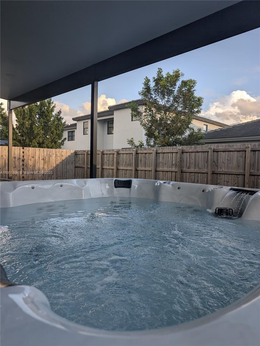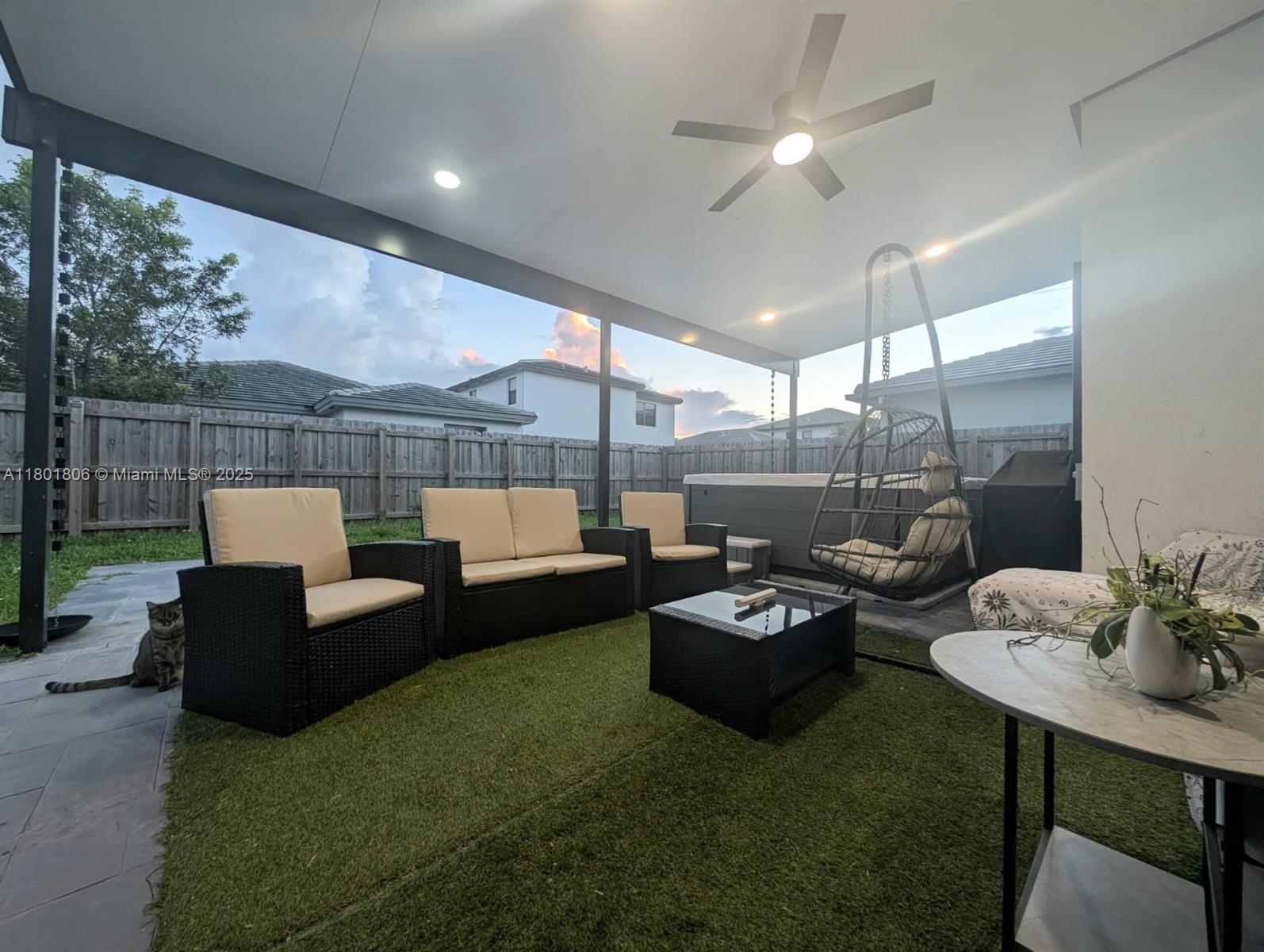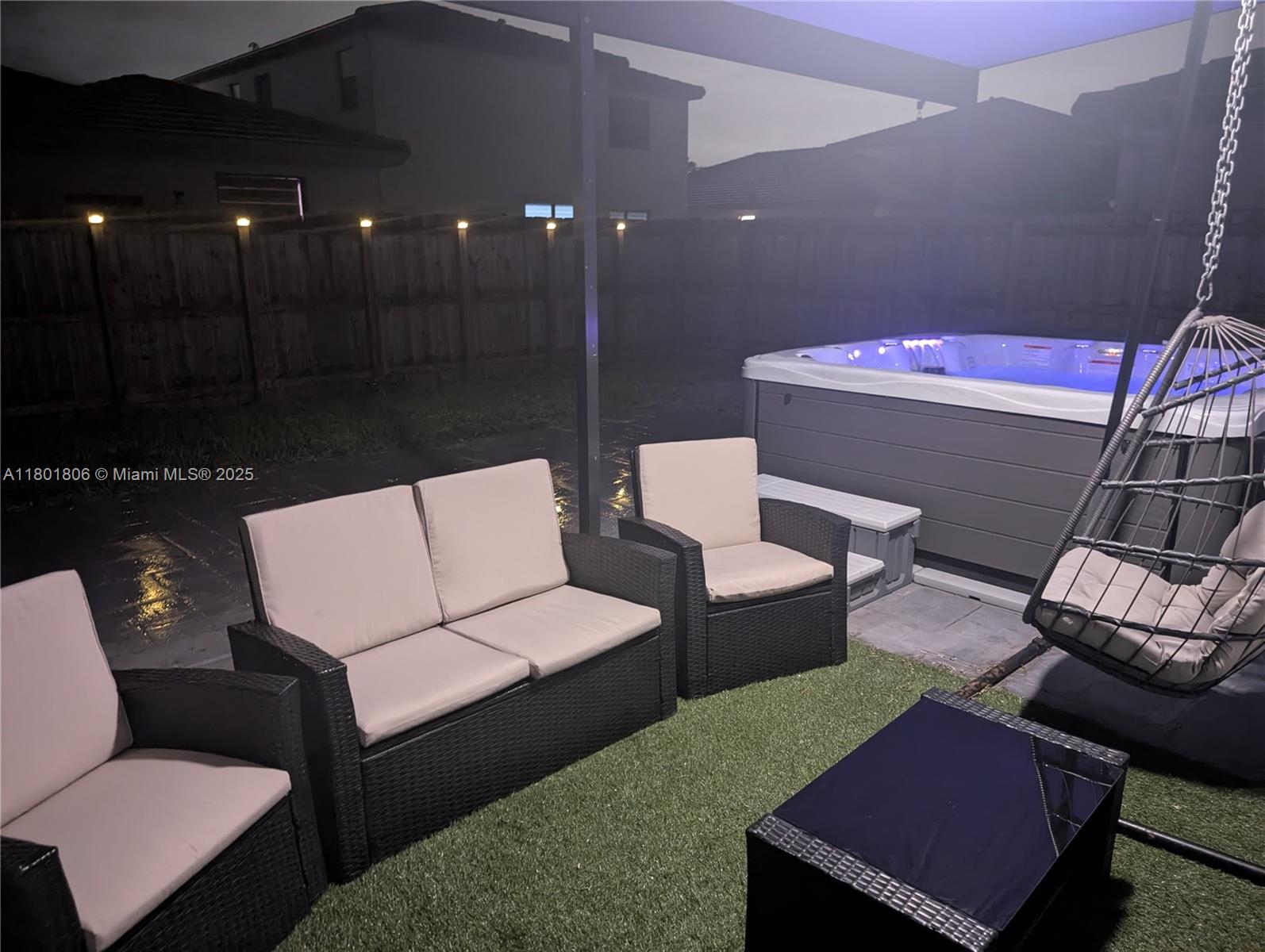 Welcome to this partially furnished 5-bedroom, 3-bath home in a gated community.The entire house features upgraded laminate flooring and blackout curtains throughout, and one room is fully equipped as a Tonal fitness studio. The open-concept layout flows directly to a fully outfitted backyard oasis with custom pergola, hot tub, outdoor furniture, and built-in grill—ideal for year-round entertaining. Eco-friendly upgrades include rooftop solar panels and an electric-vehicle charging station. The attached two-car garage offers ample storage and direct access. Residents enjoy resort-style living with a bus stop at the community entrance and top-rated schools across the street. Shopping, banks, pharmacies, cafes, Walmart, Publix, the post office, and Home Depot are within walking distance.