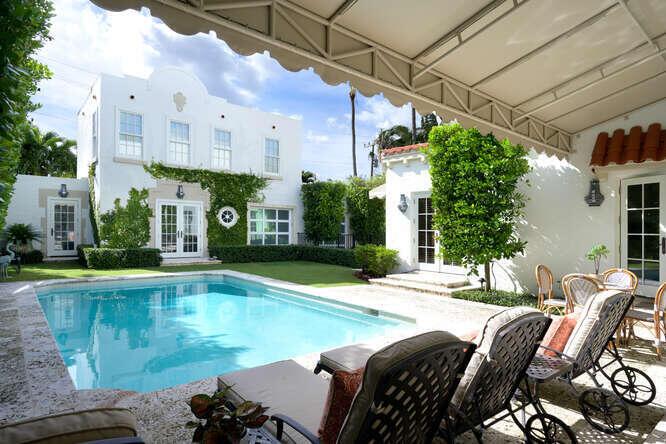 Exceptional Ocean Block Rental on Brazilian Ave. Just steps from the beach, Worth Avenue, and dining, this stunning property includes a 4-bedroom, 4.5-bath main house and a 2-bedroom, 2.5-bath guest house. The home is filled with exquisite architectural details and flooded with natural light. The main level features a grand double living room, formal dining area, library, and family room. The chef's kitchen is equipped with a Lacanche range and storage island. Soaring ceilings, light oak hardwood floors, an elevator, and gracefully curving staircases enhance the home's charm. French doors open to a coquina stone-covered patio and heated pool, surrounded by lush landscaping for ultimate privacy. Outdoor features include an outdoor shower, electric gate, and two car charging stations