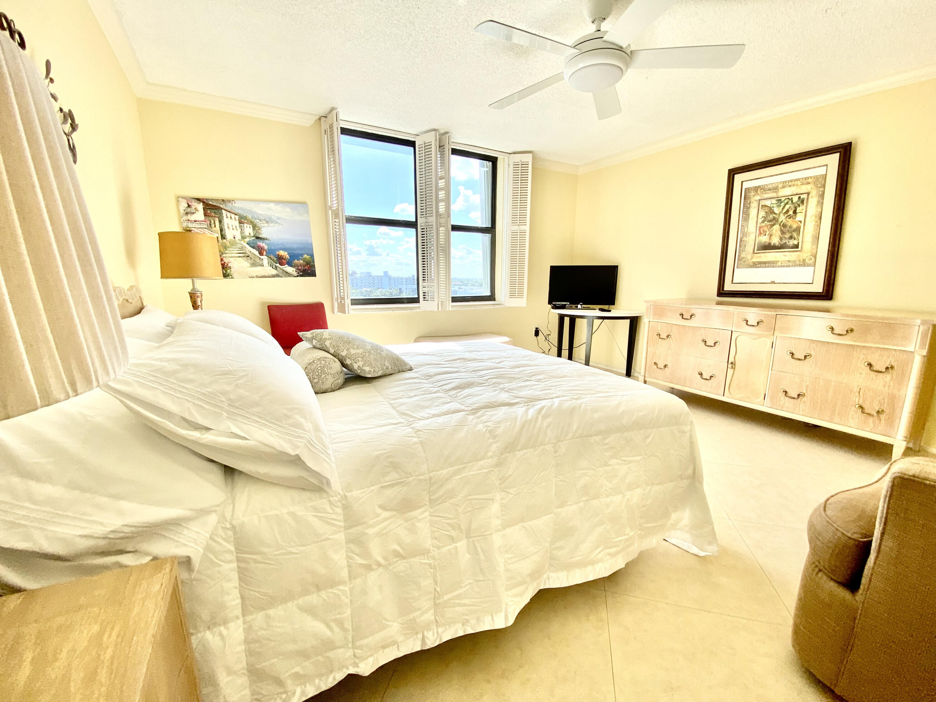 This fully furnished turn-key bright and light condo in Highly Desirable Claridges building impresses with a wraparound balcony with views of both the intracoastal and the ocean. The condo has everything you need to live and enjoy in the Palm Beach! Huge 1450 sq ft under air 2 BR/2 BA apartment will not disappoint: Tile throughout, large bathrooms with Shower and Bathtub, walk-in closets. Fully equipped kitchen with SS appliances. Hurricane Impact Windows and Accordion Shutters for Full Storm Protection. Assigned parking. Stay active using Great Amenities such as Deeded Private Beach, Guard Secured Lobby, Heated Community Pool Overlooking the ocean, Billiard Room, Exercise Room, BBQ Area, Business Center, Party/Club Room with kitchen. Condo Association fee has cable and water included.