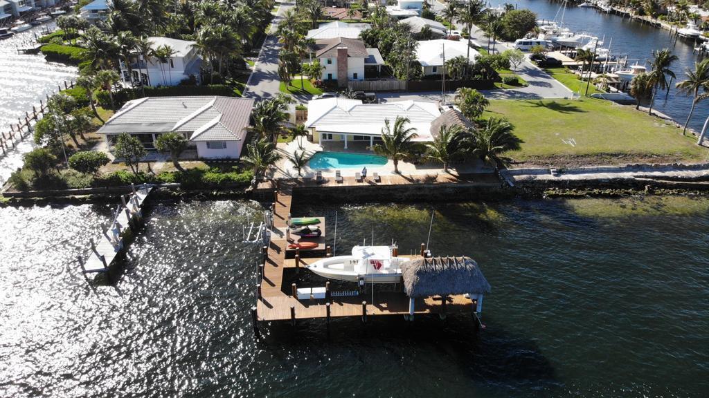 Fully Furnished Just bring your toothbrush. Direct Intracoastal pool home. Boater's delight - to the inlet from your dock in 3 minutes! Boat Dock and jetski lift. Immaculate, well cared for home with picturesque wide Intracoastal views. Located in the boater's haven community of Harbor Estates. Don't wait to see this home. Sleeps 8. Accessible platform LIFT for water sports and BYO jetskis. Available kayaks and paddle boards for use. Lounge on the hammock over the sand or sit in the suspended chair beneath the Tiki Hut. Gourmet outdoor grill and burners. There is an insta-hot Two tikis out door Kitchen Tiki & Dock Tiki, Green egg for smoking, grilling, or homemade pizza. Watch, feed or catch many species of fish off the 160 feet dock