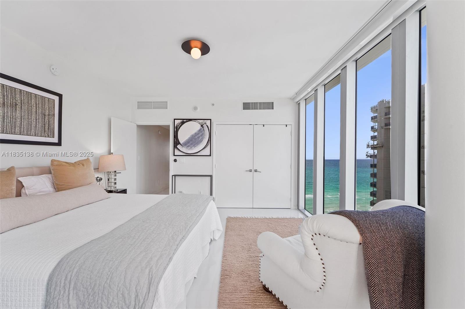 DIRECT OCEAN VIEW along with stunning bay, sunset, and city views from flow through corner unit at Carillon Miami Wellness Resort. Outdoor living space with large balcony spanning living room and master bedroom facing the ocean and an additional balcony off the second bedroom for enjoying sunsets. Some of the furniture and art in listing pictures will be exchanged with same modern classic style. Classes from morning until early evening offered 7 days a week. ALL included in rent. Indoor connector to 70,000 sq.ft hotel/fitness center. Thermal water therapies for relaxing and rejuvenating mind, body and soul. Three pools, bar, restaurant, 24hr sec, valet, concierge, salon, corner store, wellness staff. May consider committing now for winter season at $14,000/M. No pets. Min 6 mos lease.