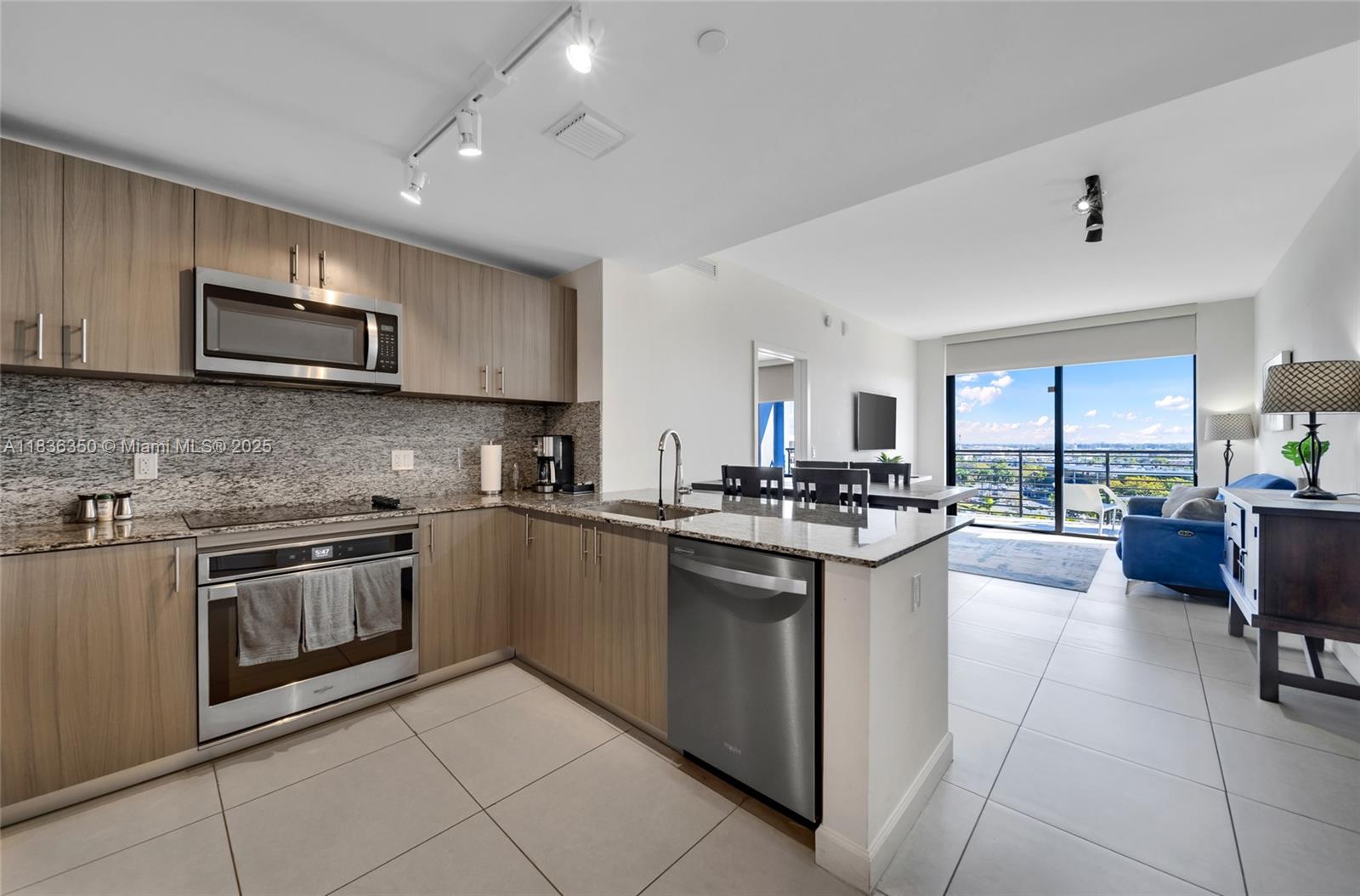 Fully furnished rental in the heart of Downtown Doral! This spectacular 1 bed / 1 bath condo offers modern finishes throughout, including a sleek kitchen with quartz countertops and backsplash, stainless steel appliances, dishwasher, and garbage disposal. Porcelain tile flooring throughout, a spacious walk-in closet, and stunning park and city views add to the appeal. Enjoy peace of mind with impact windows for safety and noise reduction. The building features top-tier amenities: pool, sauna, massage room, fitness center, kids' playroom, valet parking, and more. Located near A+ schools, great restaurants, shops, and supermarkets. Only 15 minutes from Miami International Airport. Available fully furnished – just bring your suitcase!