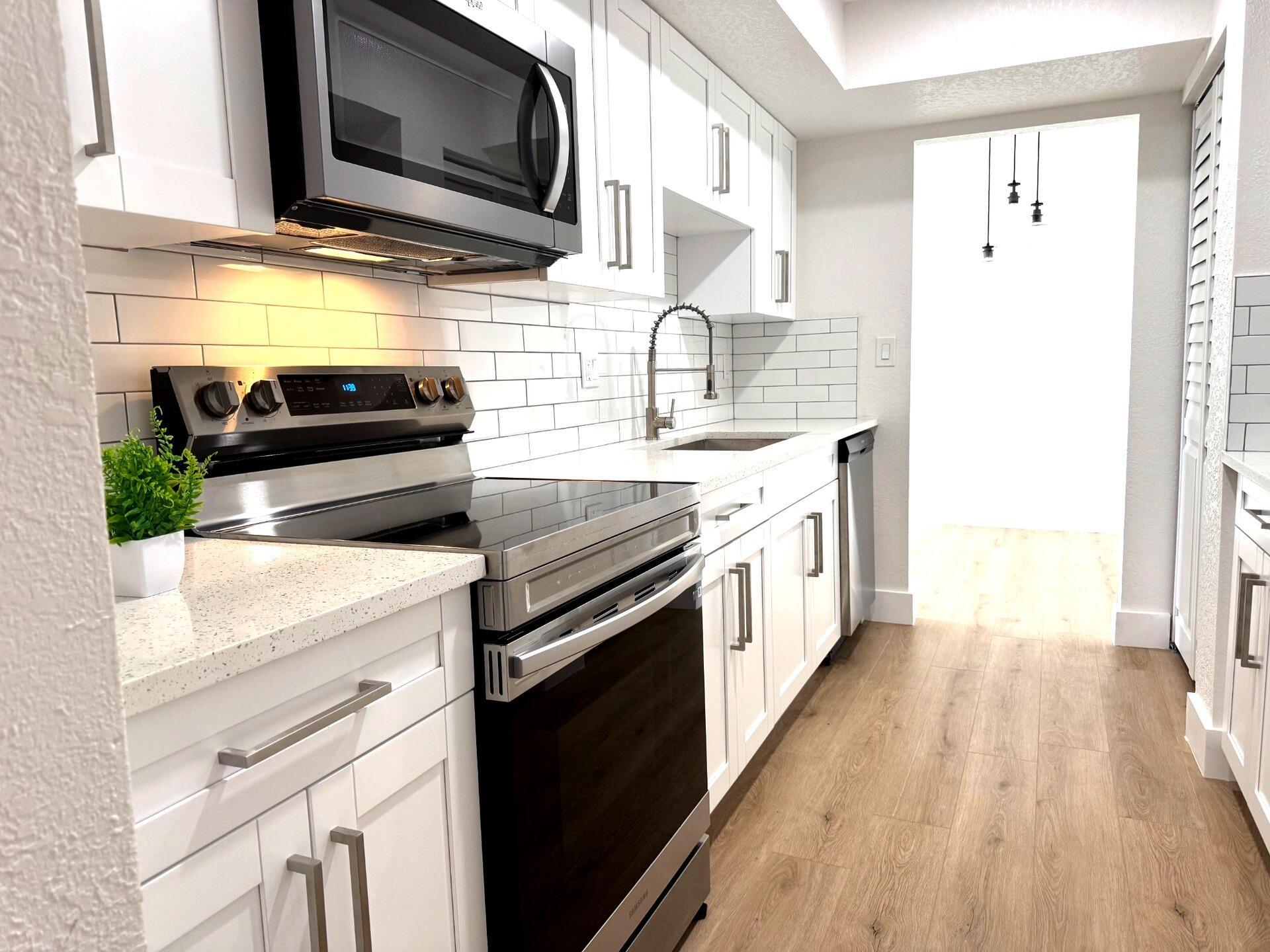 Discover this fully remodeled 2-bedroom, 2-bathroom condo in the desirable Environ community. Located on the 6th floor, the spacious 1,148 sq ft interior features luxury vinyl flooring throughout, a modern kitchen with white shaker cabinets, quartz countertops, recessed lighting, and brand-new appliances--dishwasher, stove, microwave, and air conditioning. Both bathrooms boast contemporary finishes. Large bedrooms include walk-in closets, stylish barn doors, and modern ceiling fans. Step out onto the private balcony to soak in tranquil lake and golf course views.Situated in a gated, resort-style community, residents enjoy access to a clubhouse, fitness center, pool(s), and round-the-clock security.