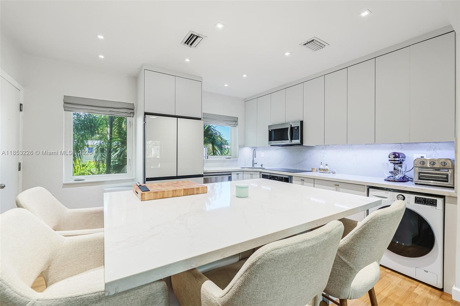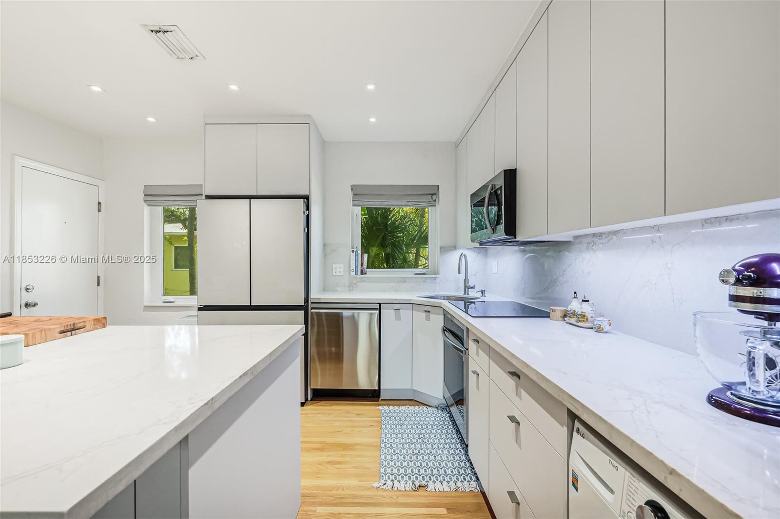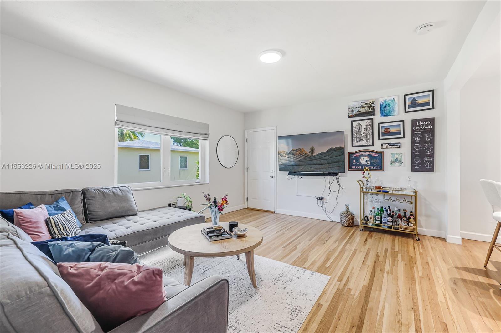 Located within South Miami's most sought-after community of High Pines, is this beautifully renovated 2 bedroom, 1 bath apartment in a boutique-style building, surrounded by lush landscaping in a family-friendly neighborhood. The tastefully designed unit has lots of natural light and open concept main living area, ideal for hosting. Kitchen features state-of-the-art appliances, sleek cabinetry, wine cooler, and plenty of storage space. The meticulously designed bathroom evokes serenity and a warm atmosphere. Washer/Dryer in unit, impact windows, window treatments & hardwood floors. The complex has a pool, easy parking, and laundry facility. Property is a short distance from Downtown South Miami, Whole Foods, CVS, Publix, shops, dining, University of Miami, Metrorail, and A+ rated schools.