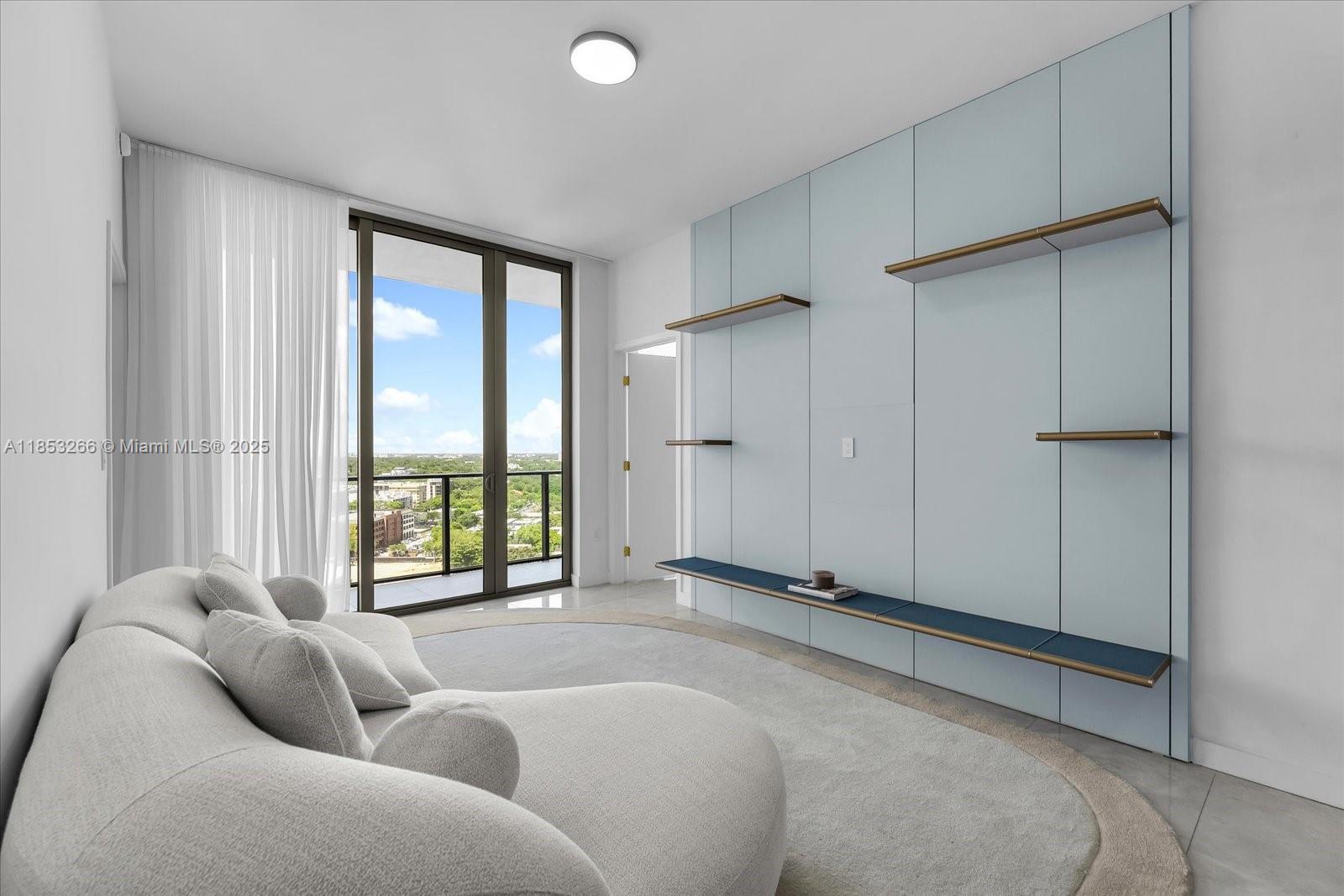 The open-concept layout features floor-to-ceiling windows, filling the space with natural light and framing serene views of Biscayne Bay, Coconut Grove’s lush canopy, or the Miami skyline. The sleek chef’s kitchen is outfitted with custom Italian cabinetry, premium Sub-Zero and Wolf appliances, and quartz or terrazzo countertops – perfect for both everyday living and entertaining.