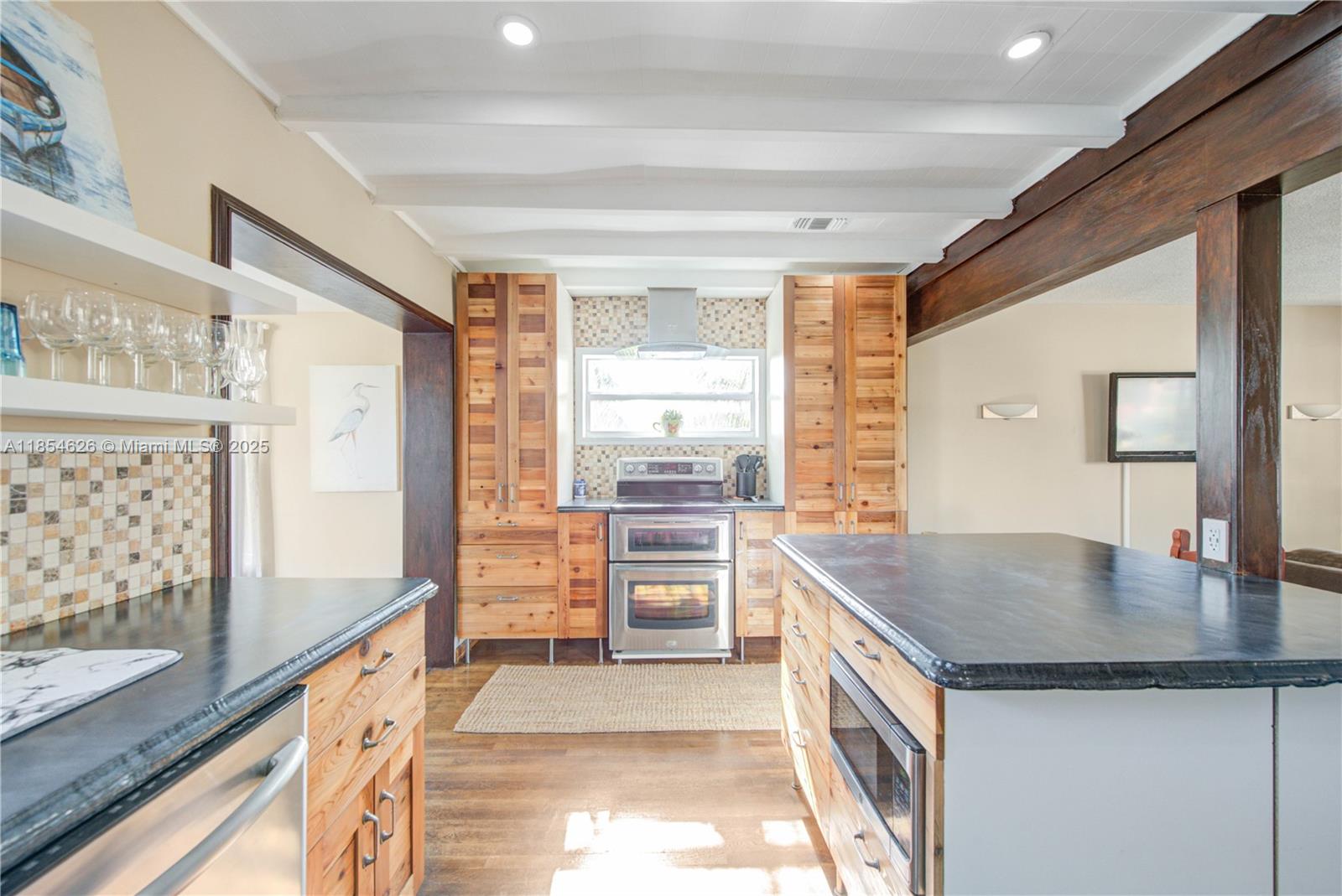 Welcome to this lovely 2 story SFR on an oversized 7407 Sq ft lot. Located in Hallandale Beach's most coveted area, where it's an easy bike ride to the beach, and less than a mile to Anchor Shopping Center and Gulfstream Park. This home has a very unique floor plan with 3 levels, where there are 2 bedrooms on the 1st level with a full bath and attached garage. The next level you will find a beautiful open concept kitchen with an island, a dining room overlooking the spacious backyard and a family room in the front with oversized windows. Upstairs is the private master's suite with a spa-like bathroom and a walk in closet with a barn door. Impact windows throughout and in a very quiet, walkable neighborhood.