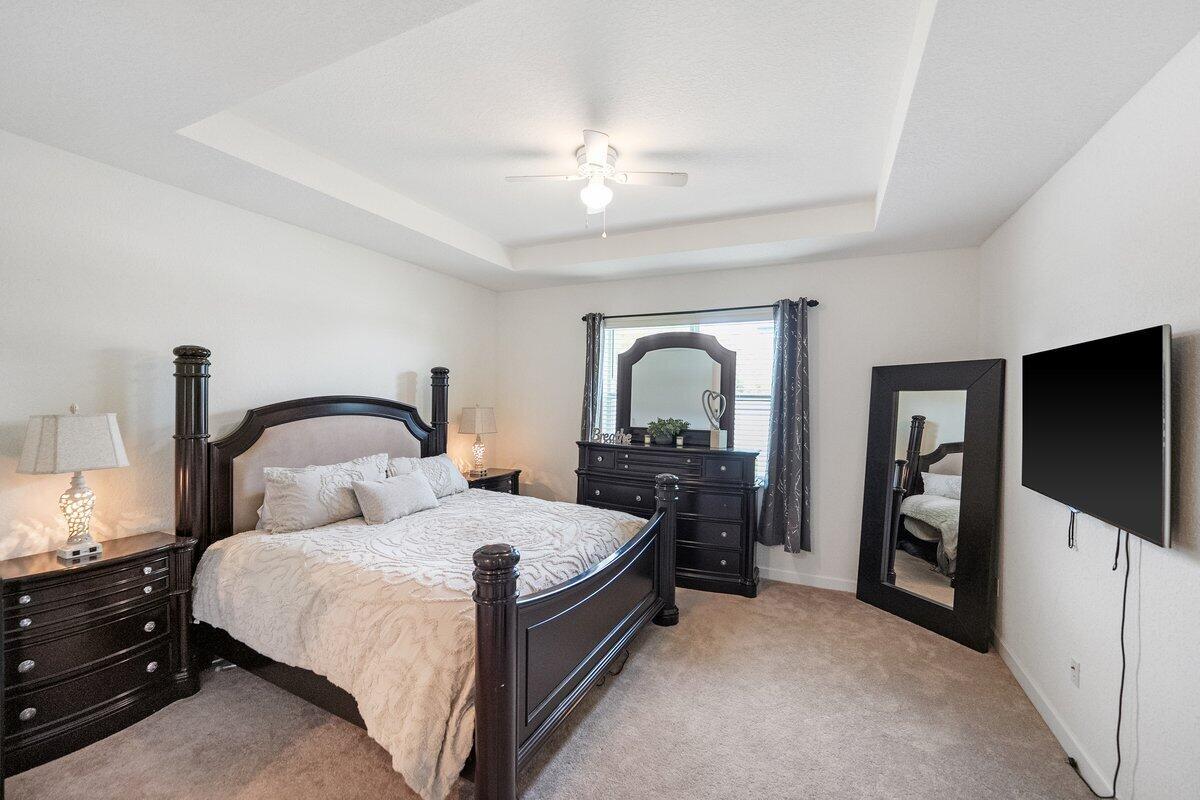 This UNFURNISHED home features 3 Bedrooms plus a DEN/OFFICE, ( pictures are from a previous tenant) The den Can be used as an office or easily converted into a 4th Bedroom. ALL NEW CARPETS AND WOOD FLOORS PLUS ACCORDION SHUTTERS. and NEWER A/C. The master suite is a retreat, showcasing elegant tray ceilings, expansive walk-in closets and dual sinks for added convenience. On the opposite side of the home, you'll find the two additional bedrooms and a dedicated laundry room, thoughtfully placed for privacy and functionality. Step outside to your backyard oasis, where a semi-fenced patio invites you to relax, entertain, or grill the perfect steak in a peaceful, private setting. Enjoy resort-style living. The community offers amenities for the whole family.
