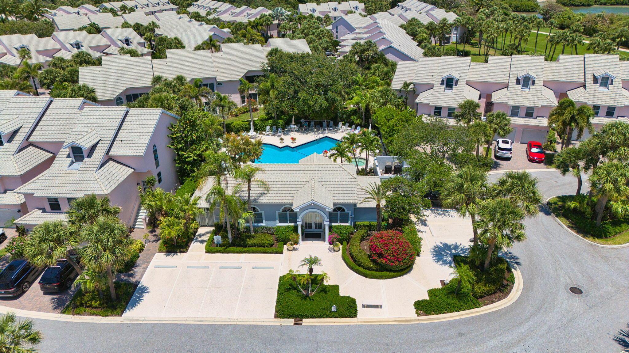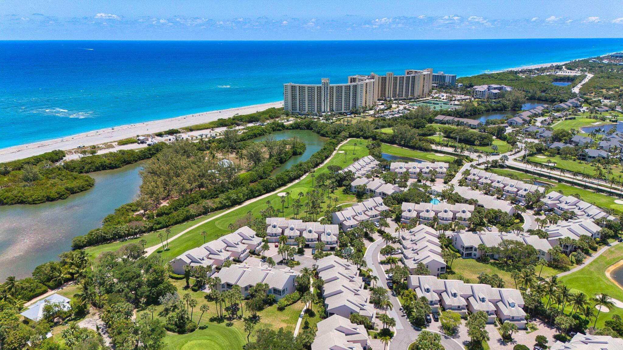 Available Seasonally or Annually. Walk to the turquoise waters of Jupiter Beach from this lovely 1ST FLOOR, 2 bedroom, 2.1 bath townhouse-style end unit condo in the gated, beachfront community of The Estuary. This beautiful updated residence is located on the ''back nine'' of the Jupiter Dunes Golf Course & nestled between DuBois Park, Jupiter's natural estuary & Atlantic Ocean. Relax on the impact glass lanai overlooking the golf action on the 15th fairway. Additional features include: renovated kitchen w/granite countertops; Primary suite w/walk-in closet & updated bath; impact windows; tiled floors; 1 car garage; southern exposure w/magnificent views of the golf course & lake. Walk to the beach, golf, Jupiter Inlet, parks & numerous waterfront restaurants. A perfect beach retreat!