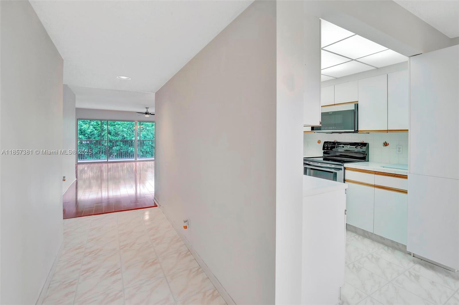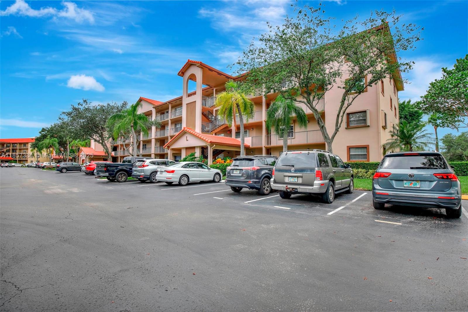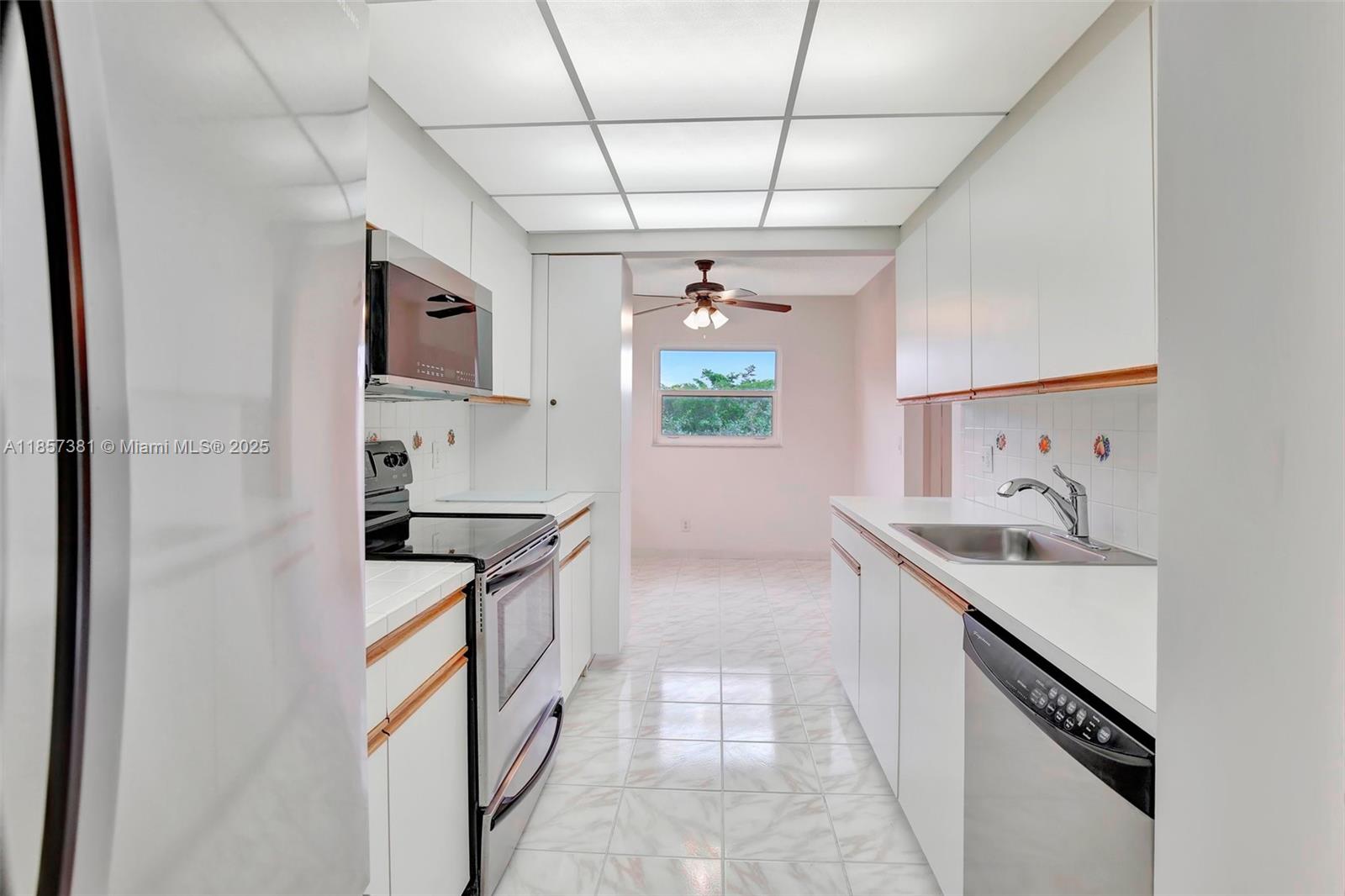 55 and older community with includes cable,internet,water,and trash. Top-floor corner unit and a breathtaking golf view with 1,507 SQ.FT. a well-maintained interior, complete with attic access through the master bedroom closet and a convenient shower bathroom. The kitchen features pull-out drawers for easy access, stainless steel appliances including a French door refrigerator and wood flooring with a high-quality finish. With hurricane impact windows and accordion shutters on the patio, peace and security are ensured, allowing for uninterrupted enjoyment of the breathtaking golf course views. Enjoy Resort-style living with a clubhouse, movies, fitness center, transportation, free golf, pharmacy, cafe, 24-hour security patrol.