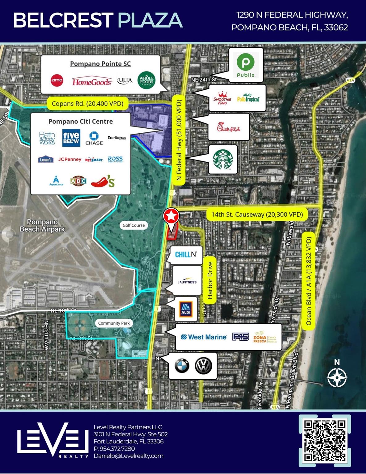 End-cap dry retail space on the north side of the plaza with huge parapet signage and excellent visibility from both Federal Hwy and Harbor Bay Drive. Wood floors, shelving, kitchenette, and ADA bathroom already built in space! Join an active community of long-standing and exciting tenant mix. 450' frontage on Federal Hwy with 55,000 VPD Located 3 miles East of I-95, 1 mile West of A1A Only A1A access between Hilsborro to Atlantic Connect to underserved retail market on barrier island via 14th St. Causeway Pull residents from booming Lighthouse Point & Pompano Beach Surrounded by many major retailers, economic drivers, and new construction.